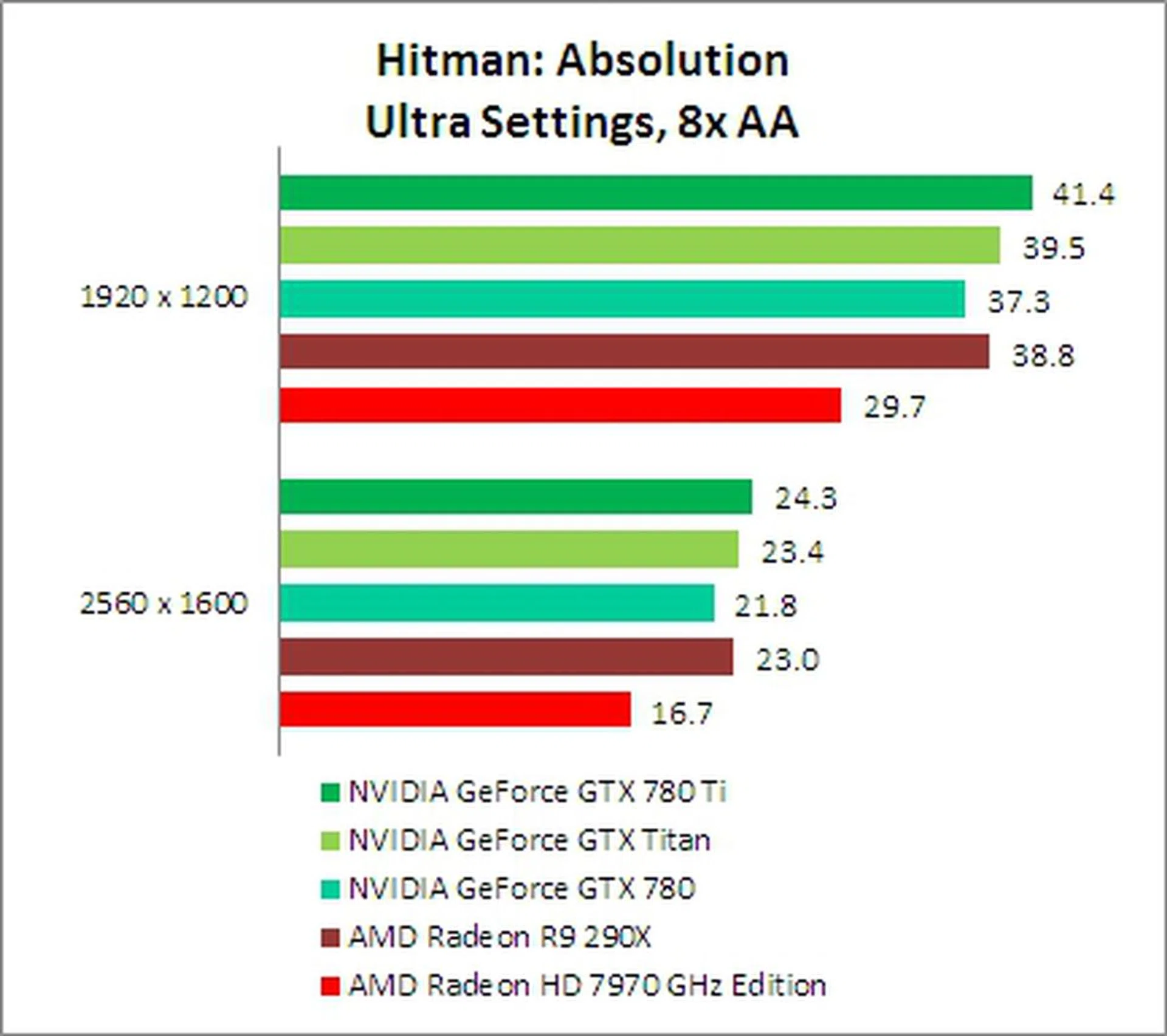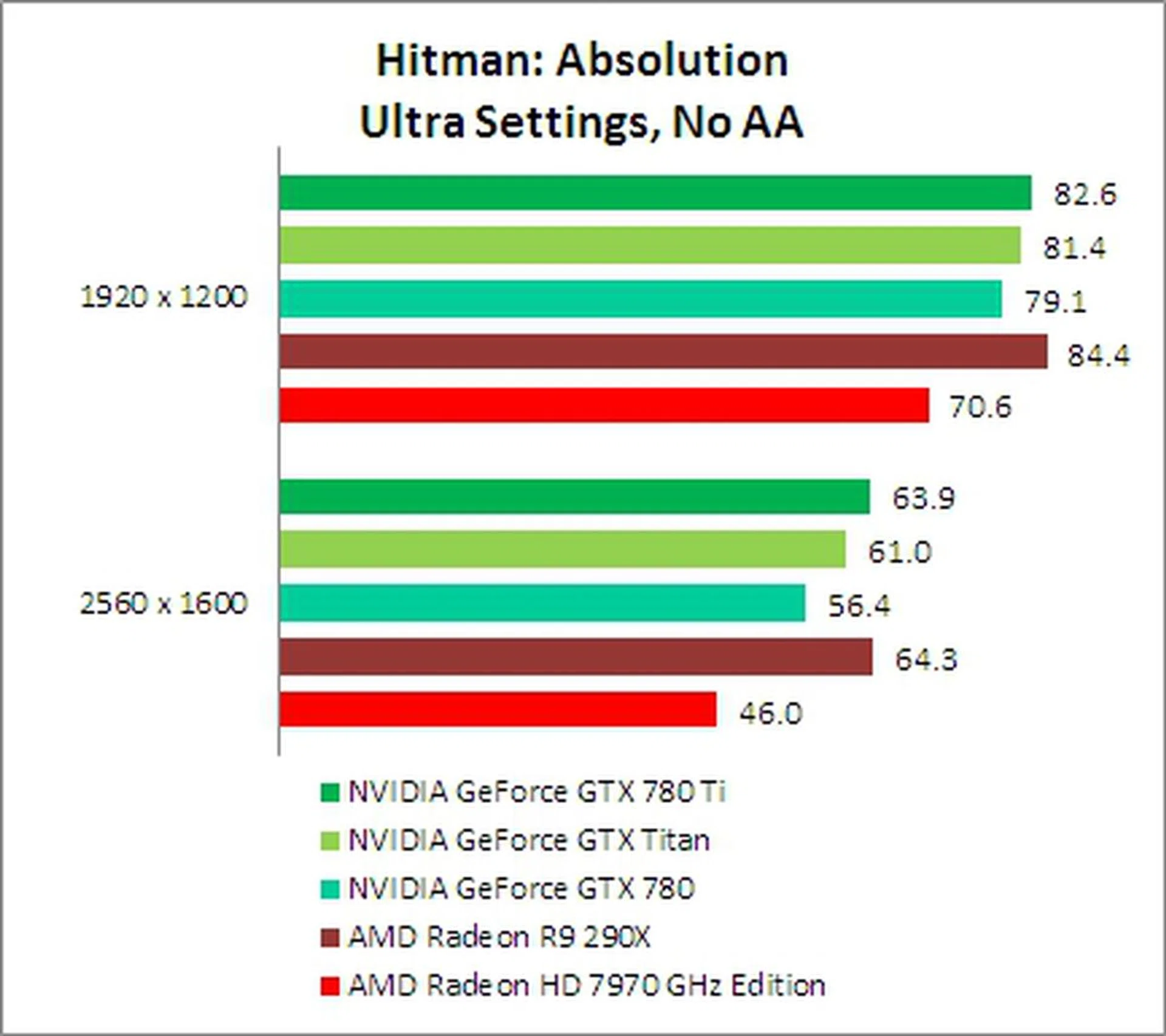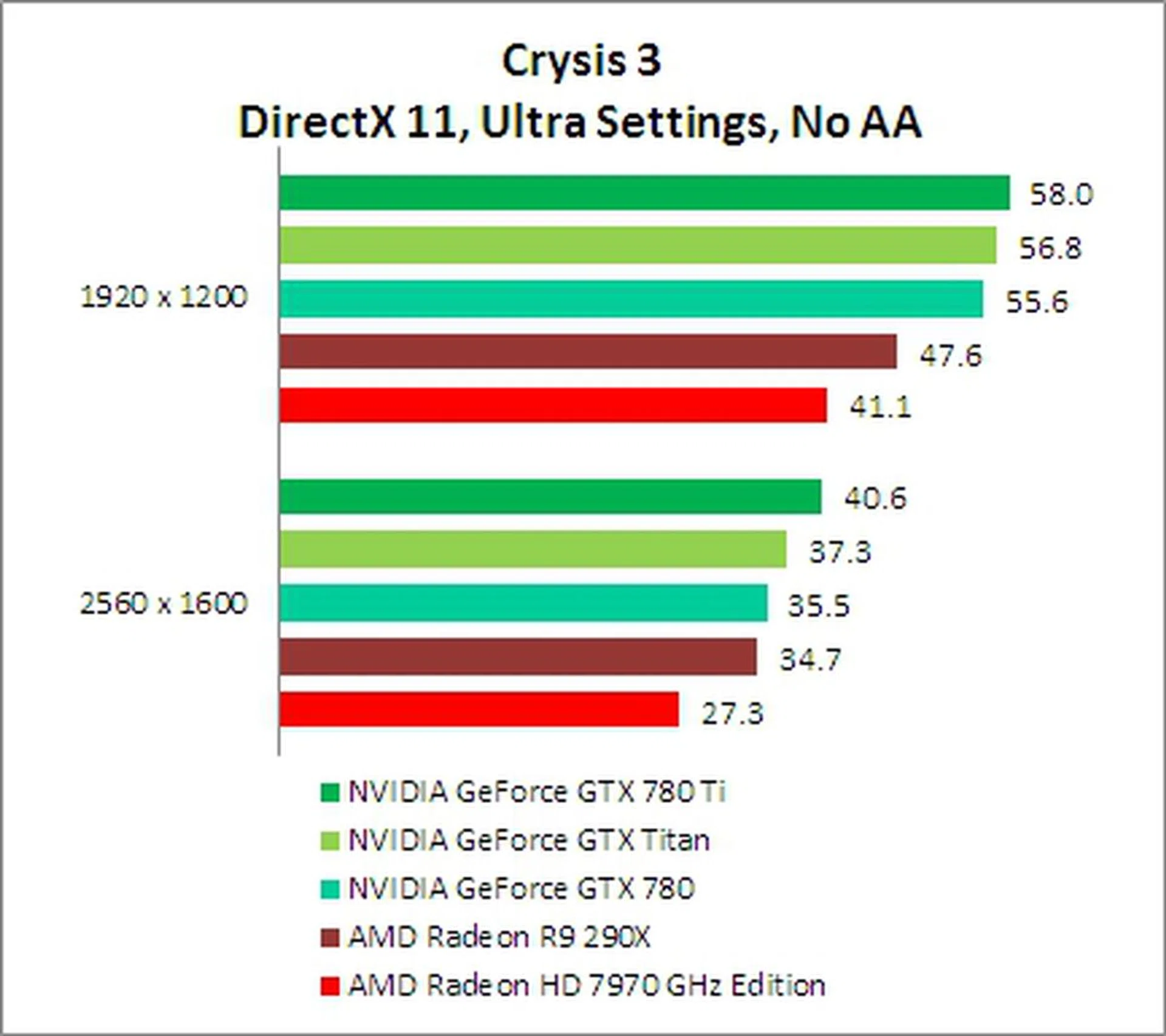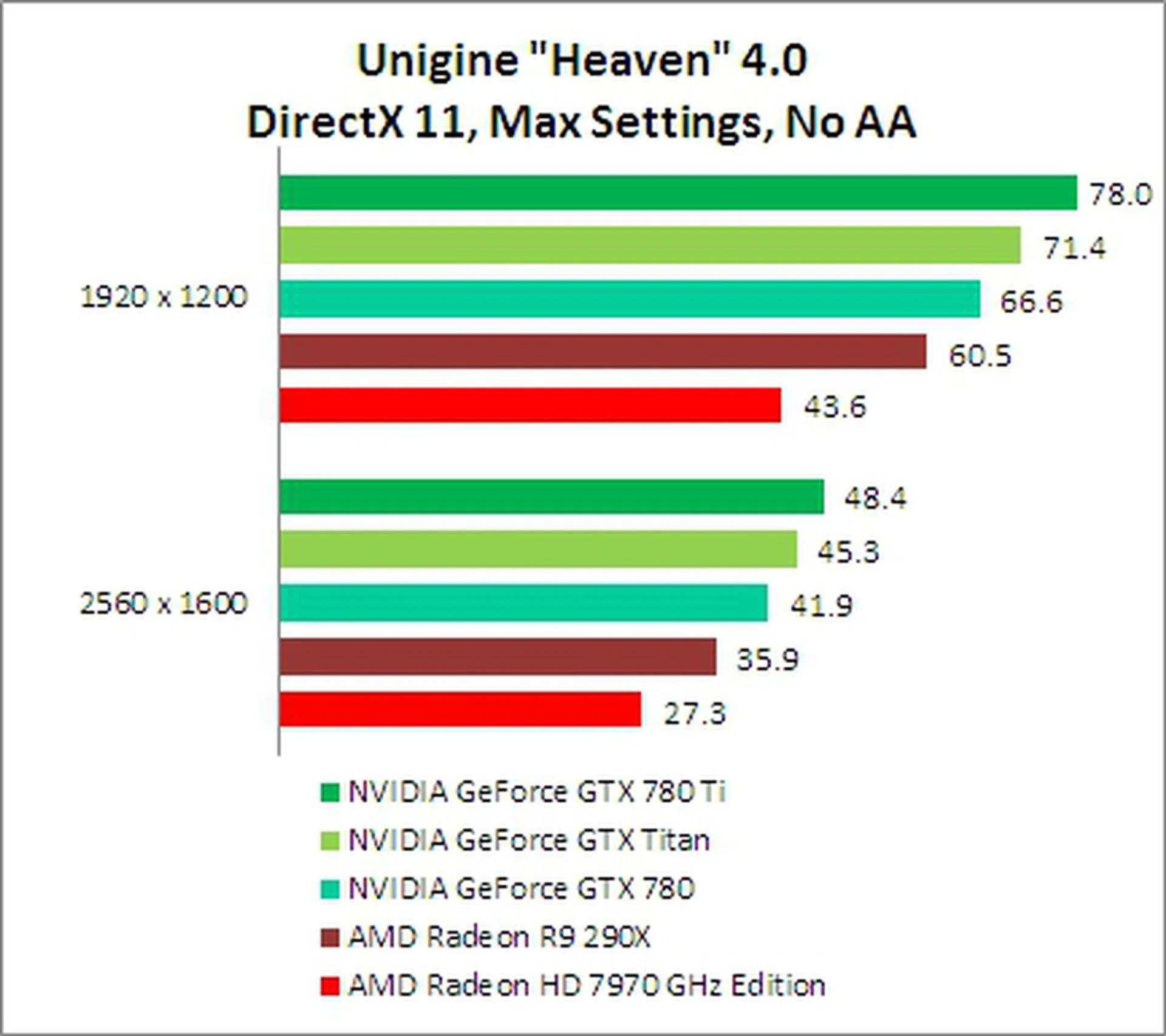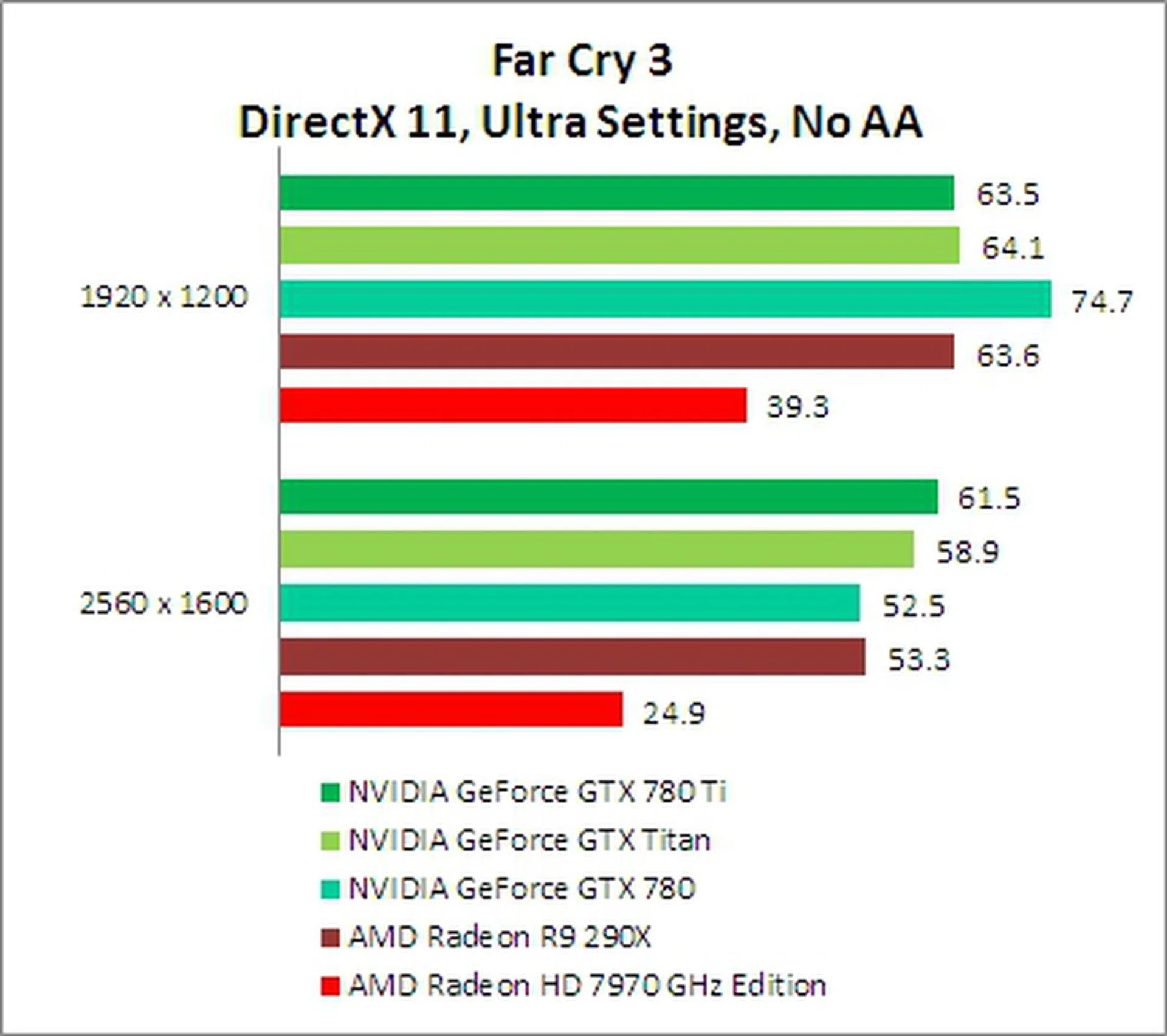 With anti-aliasing turned off, the GTX 780 Ti failed to show the strength of its 2880 CUDA cores as it was edged out by Radeon R9 290X on both resolutions by a small margin. However, with the said feature turned on, the newest NVIDIA GeForce card pulled ahead convincingly!