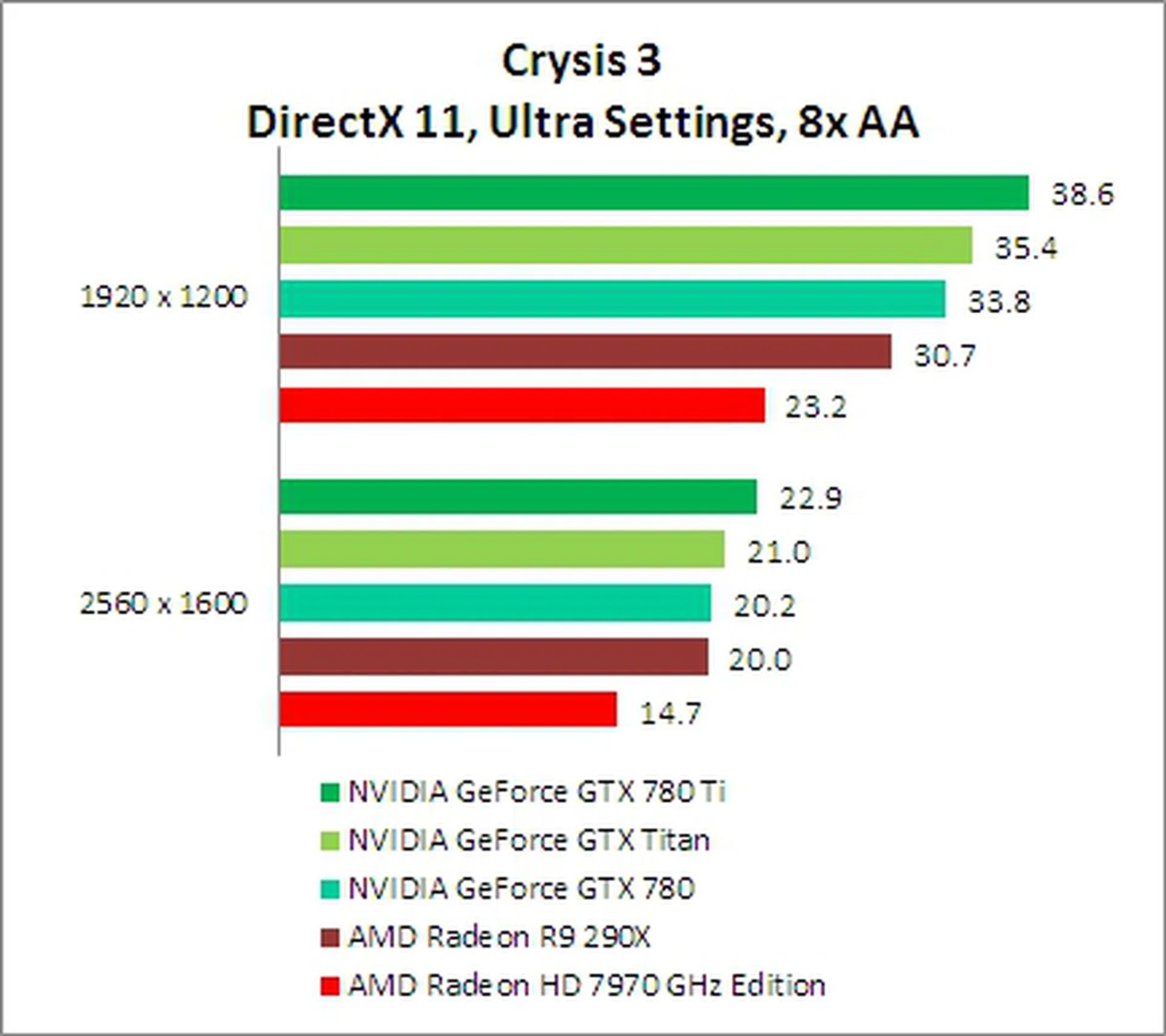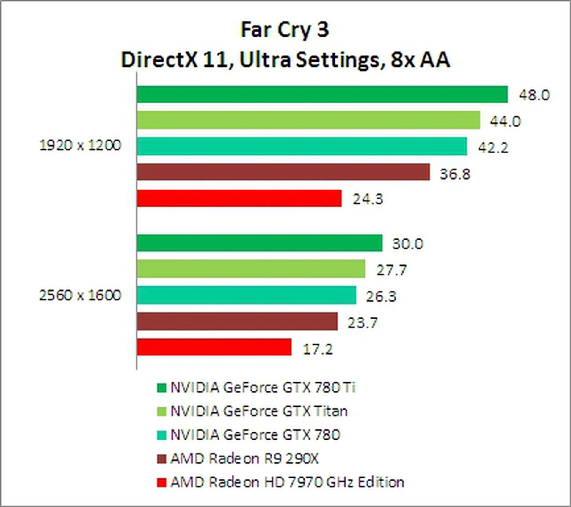 Interestingly, the GTX 780 card showed a spark of brilliance, especially at the resolution of 1920 x 1200 pixels, with the anti-aliasing feature turned off, the GTX 780 actually registered a top score of 74.7fps. This phenomenon was also observed in our initial review of the NVIDIA GeForce GTX 780 card and was constantly repeatably. In all other settings, the GTX 780 Ti card showed its mettle; at the highest game settings used in our test environment, it churned out an average frame rate of 30fps, beating all the other cards. Notably, the newcomer had an easy win of over 20% when compared to the AMD Radeon R9 290X.