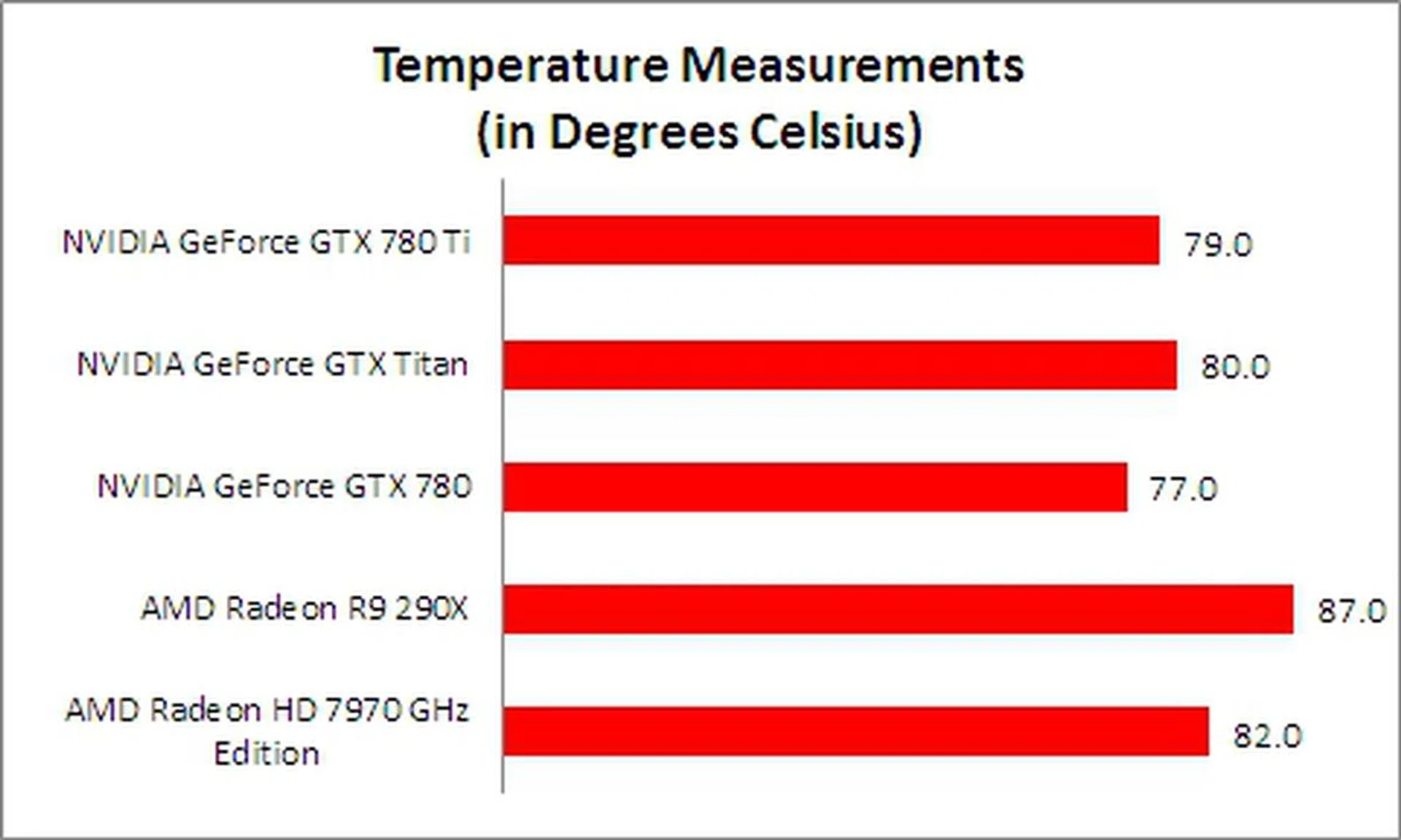 Over to the red camp, it's not looking too great. The Radoen R9 290X has a TDP of 290W with a default maximum temperature threshold set at 95 degrees Celsius! It's not wonder it registered the highest operating temperature of 87 degrees Celsius in our test. Even with greater leeway over the green camp, its actual game performance couldn't keep up with the new GeForce GTX 780 Ti.