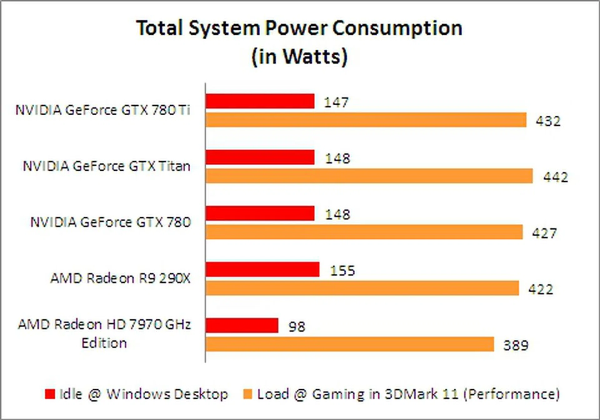 The three NVIDIA GeForce cards shared almost identical idle power draws at 148W or so. At load, they ranged between 430 to 440W bracket - the power draw of the GTX 780 Ti was just 5W higher than the GTX 780, and 10W lower than the Titan. The Radeon R9 290X card had a power draw at load that was similar to the GTX 780 card. This is partly due to each cards' performance-enhancing feature of PowerTune 2.0 and GeForce Boost 2.0 respectively, as both attempt to maximize the available power budget.