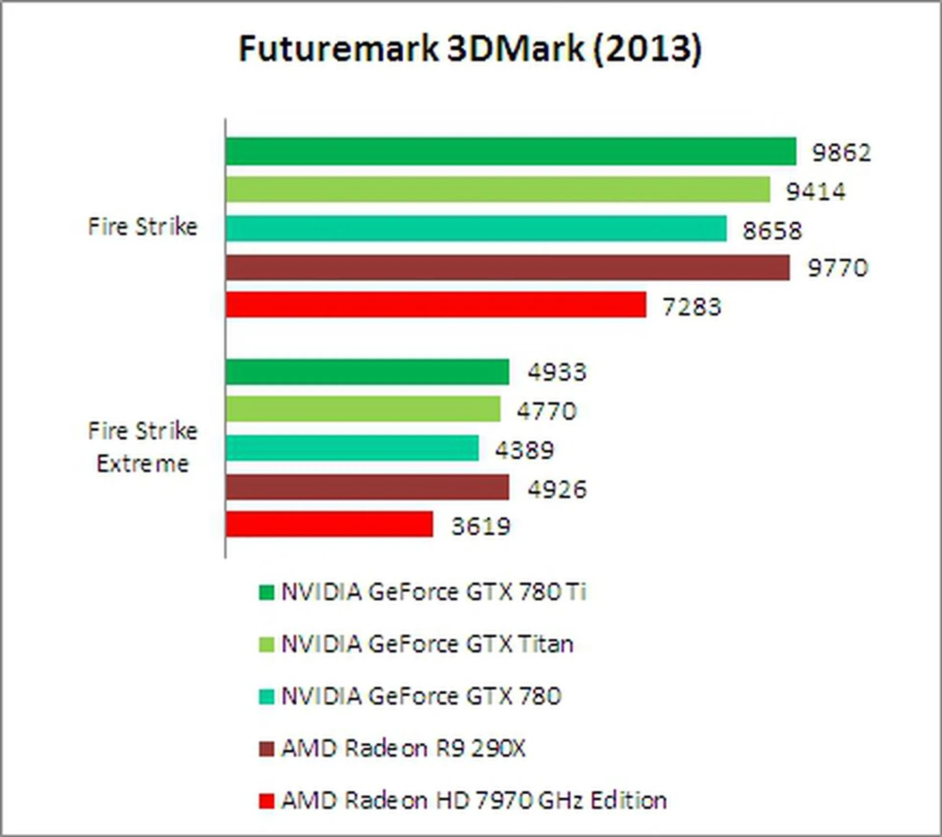 The NVIDIA GeForce GTX 780 Ti card took the top spot for both tests; however, the AMD R9 290X card was nipping at its heels. The NVIDIA card only managed to edge ahead by slightly less than 1% for Fire Strike, and for Fire Strike Extreme, the GTX 780 Ti was on par with the Radeon R9 290X. Against the GTX Titan and GTX 780 card, the new top dog showed the advantages of having more CUDA cores, as well as higher speed video memory modules that are rated at 7000GHz for increased memory bandwidth. Overall, the GTX 780 Ti pulled ahead of the once mighty GTX Titan by a margin that ranged from 3.4- to 4.8% and it was also approximately 13% ahead of the GTX 780.