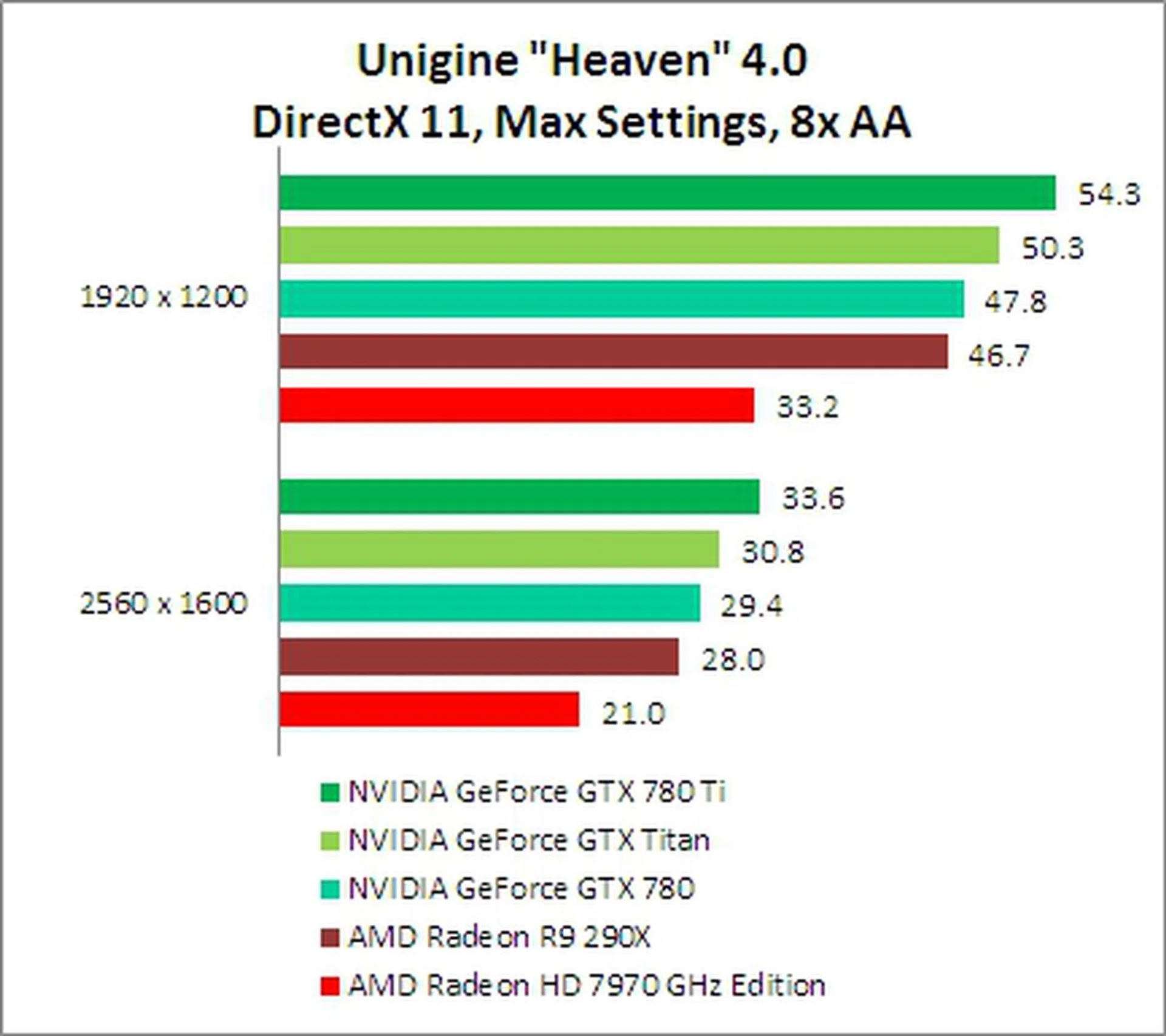 The Unigine 4.0 "Heaven" benchmark tests GPUs with extreme tessellation, dynamic sky with volumetric clouds, real-time global illumination, and screen-space ambient occlusion among others. The GTX 780 Ti continued to show its advantage in the superiority of its fully unlocked GK110 graphics core and its highly rated graphics memory. It handily took the top spot for all four test scenarios. At the highest setting, it was the only card to crack the 30fps level, with a score of 33.6fps. With this score, it pulled away from the GTX Titan and R9 290X cards, with a margin that ranged from 10- to almost 20%!