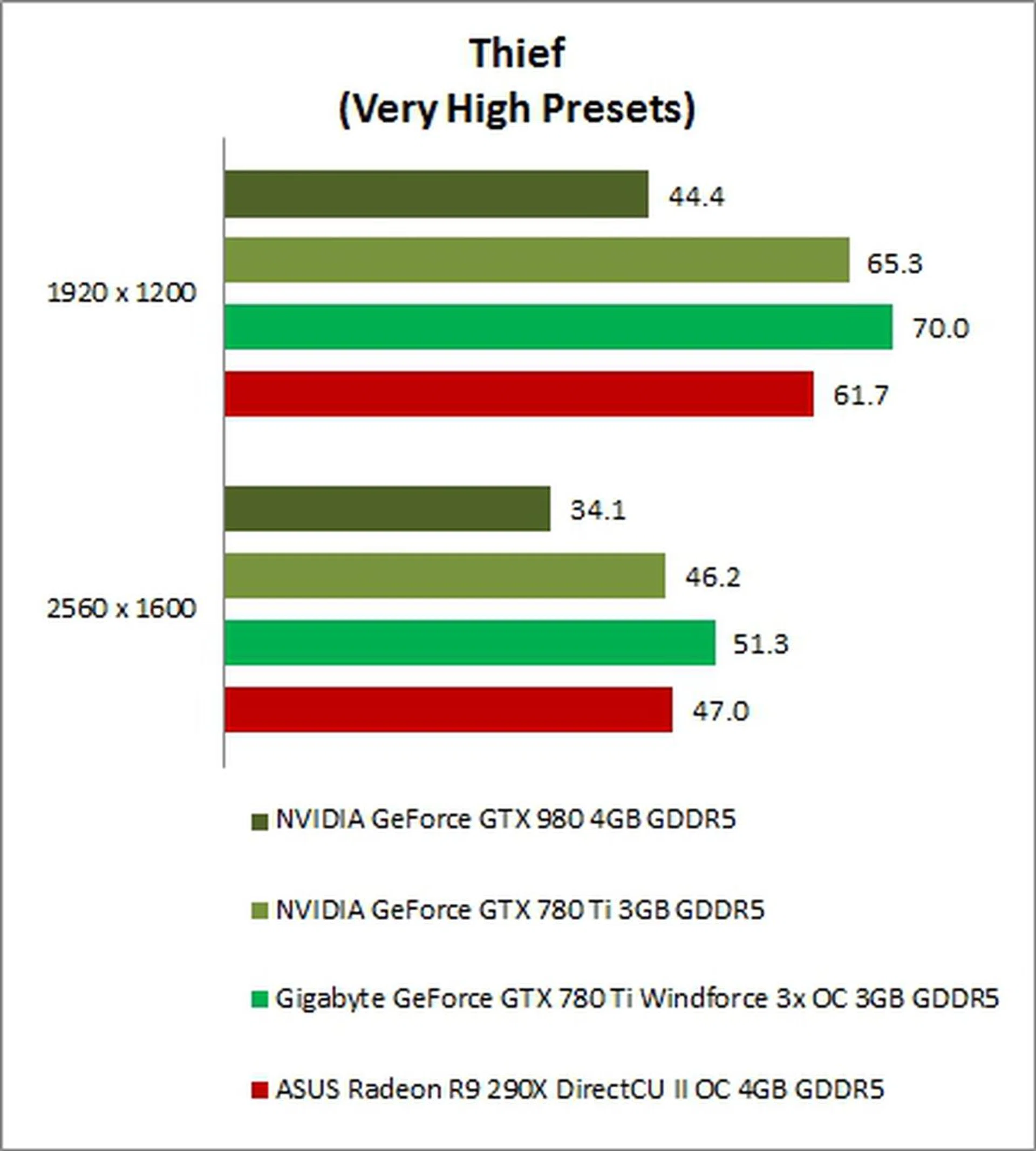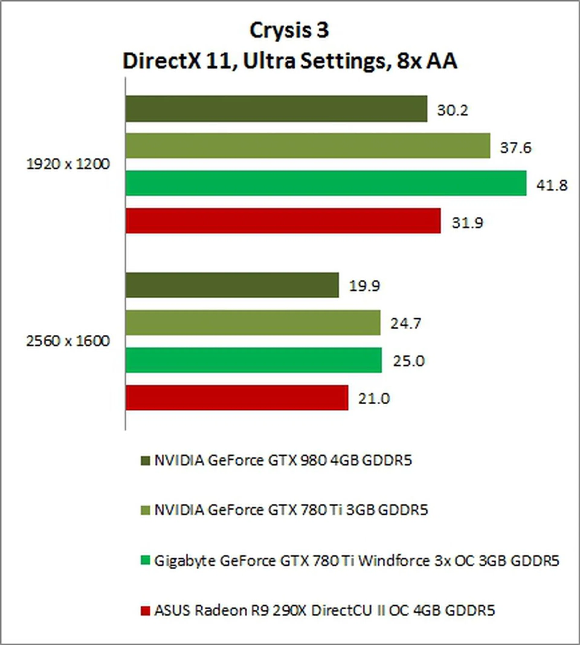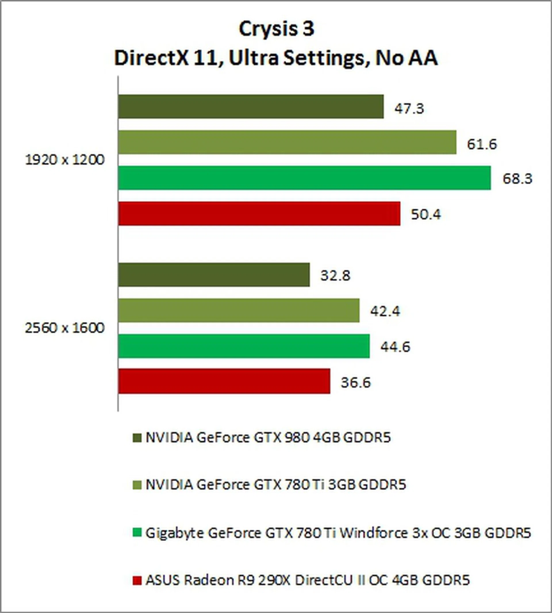 Even the stock GeForce GTX 780 Ti overtook the GTX 980; at the highest test settings, the latter was the only card to turn in a sub-20fps frame rate. Based on past experience, Crysis 3 has been the stronghold for NVIDIA GeForce GTX graphics cards. For this round, the GTX 980 card had the unenviable honor of losing ground to the rival, top-end ASUS Radeon R9 290X.
