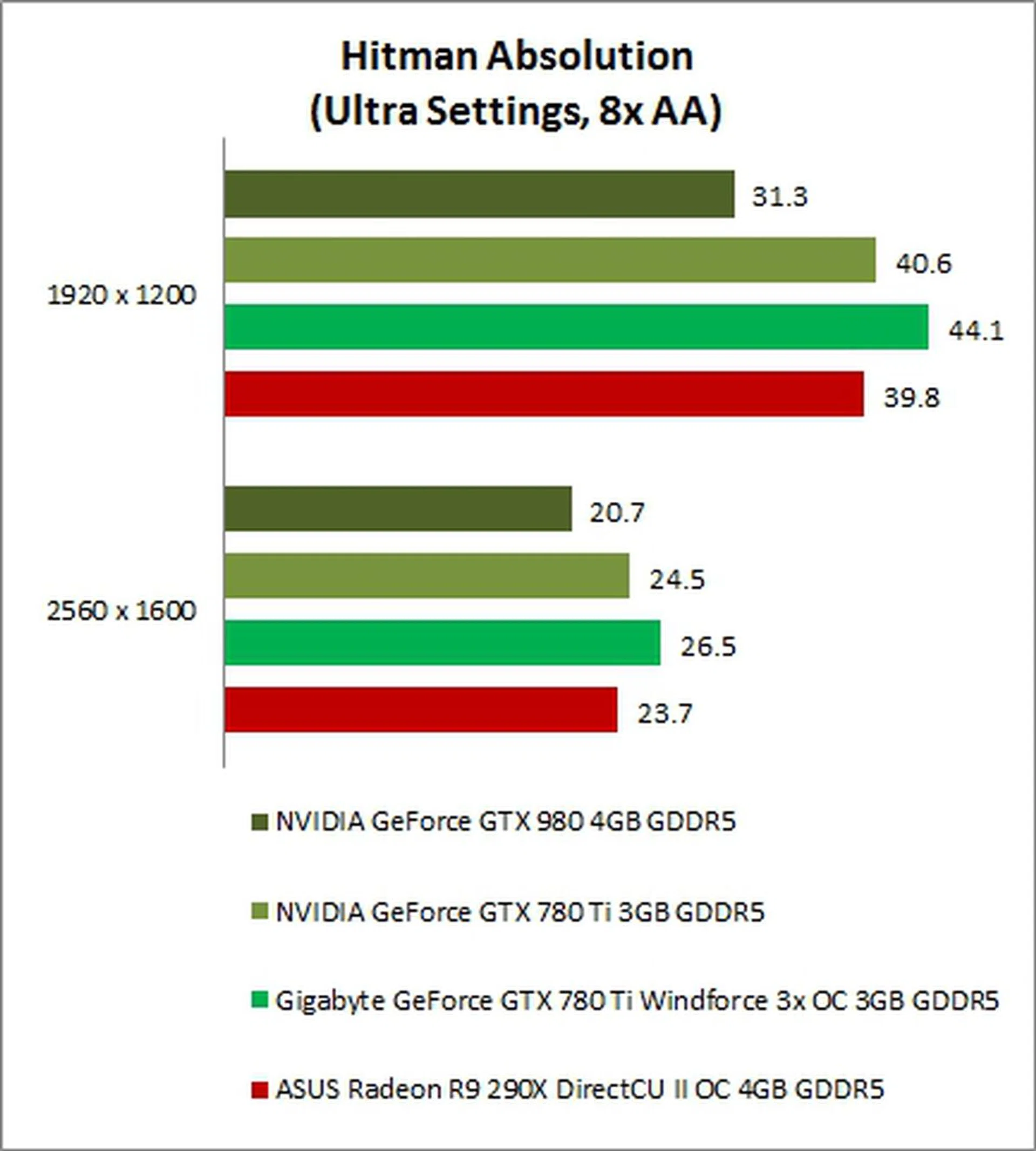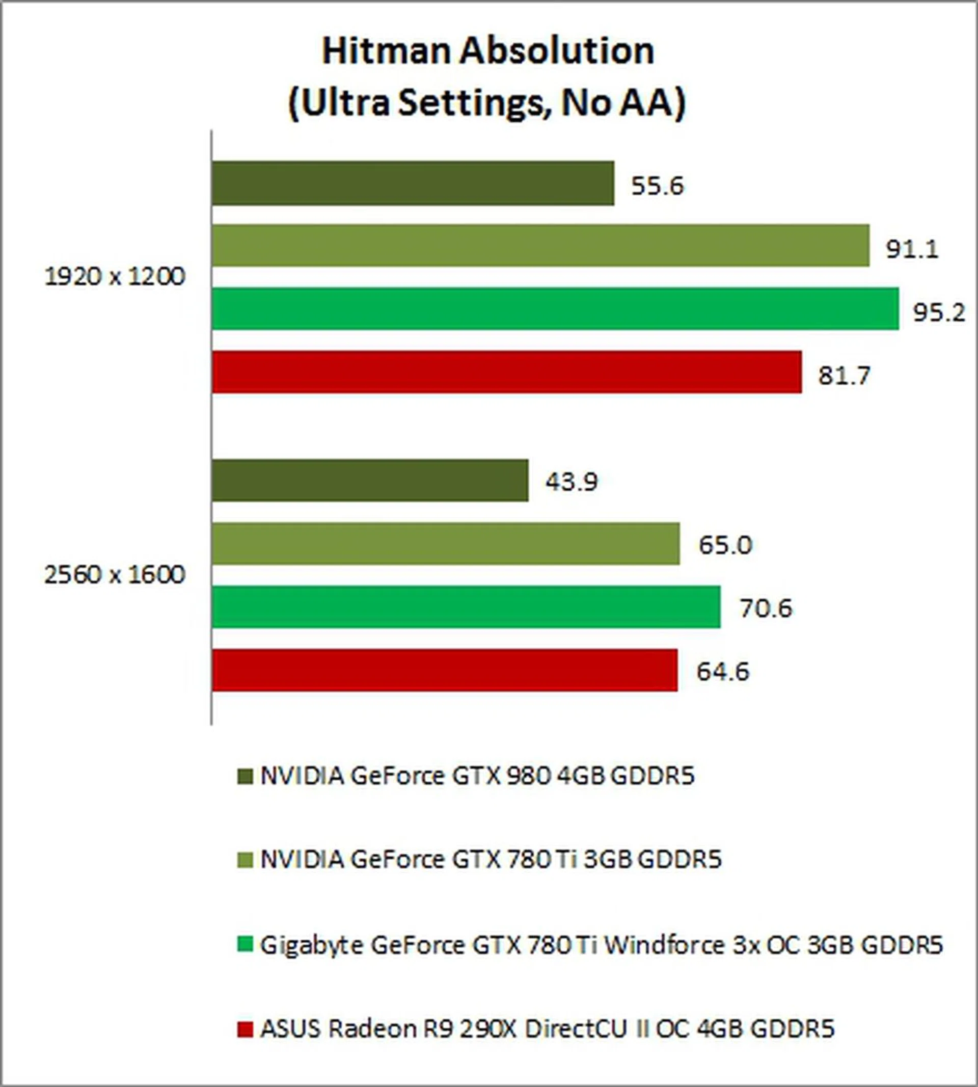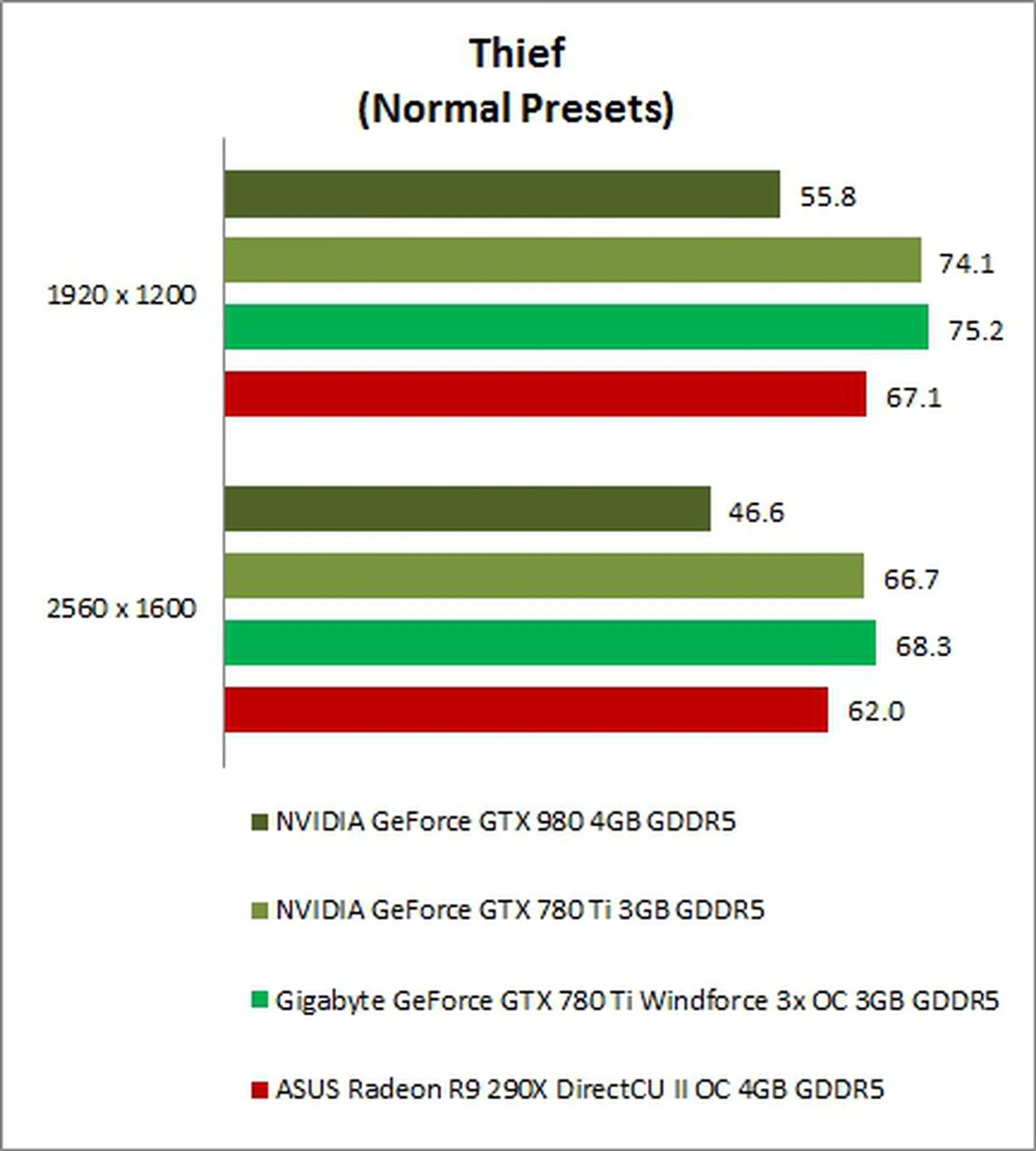 Even the stock GeForce GTX 780 Ti overtook the GTX 980; at the highest test settings, the latter was the only card to turn in a sub-20fps frame rate. Based on past experience, Crysis 3 has been the stronghold for NVIDIA GeForce GTX graphics cards. For this round, the GTX 980 card had the unenviable honor of losing ground to the rival, top-end ASUS Radeon R9 290X.