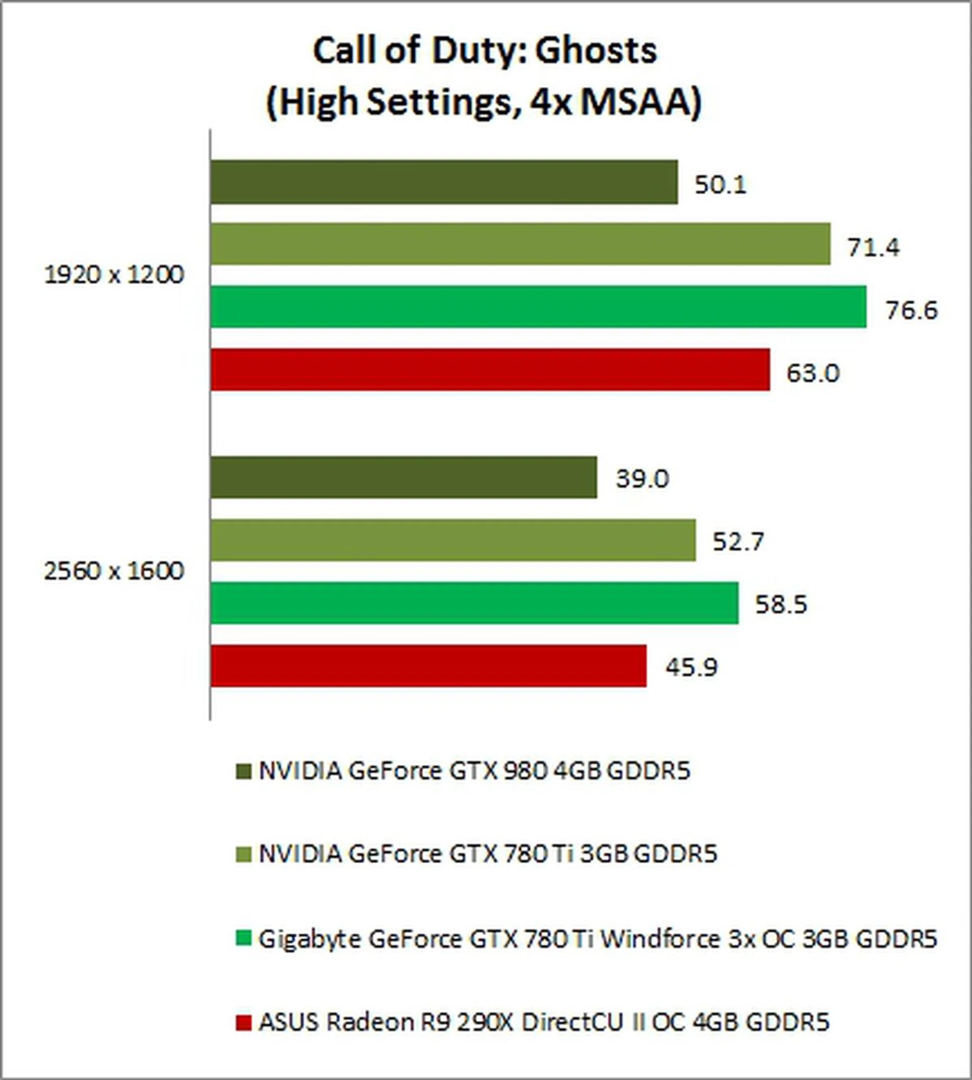Our latest gaming benchmark features the IW6 engine, which has been updated from the one that powered the Call of Duty: Modern Warfare 3. The newer game title supports NVIDIA's exclusive technologies like TXAA anti-aliasing, 3D Vision, SLI and PhysX. Despite its spanking new hardware improvements of its Maxwell architecture, the GTX 980 graphics card continued to languish.