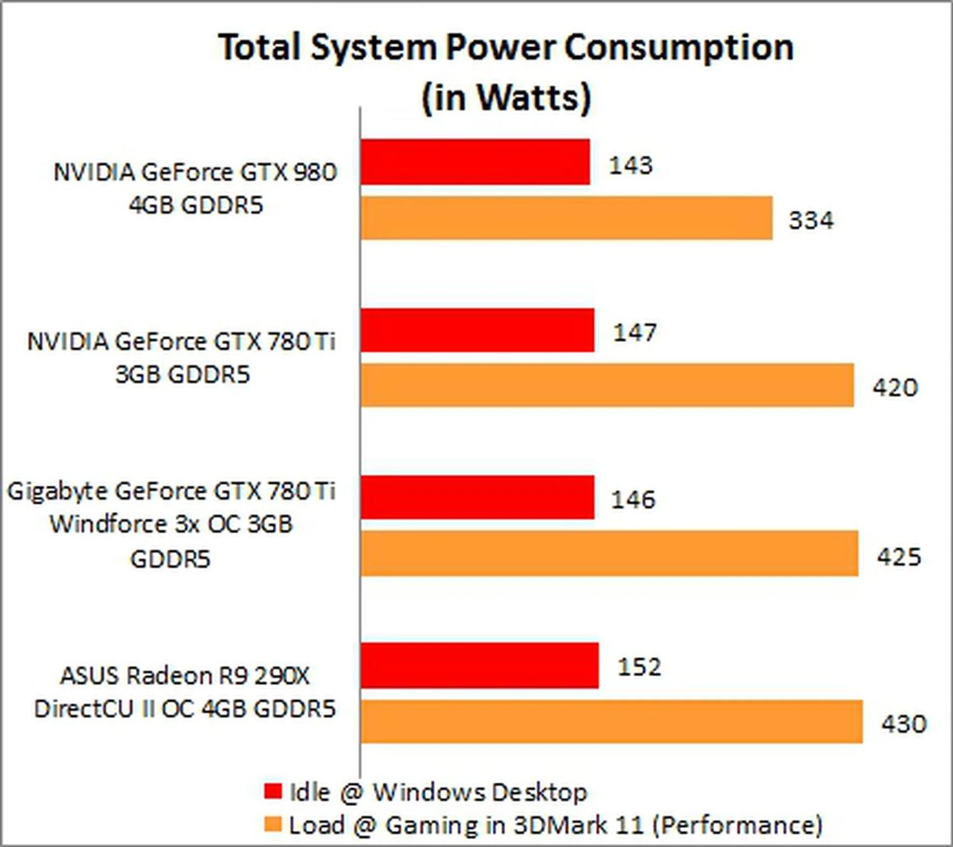 As we had mentioned earlier, the touted power efficiency of the new GTX 980 showed its mettle in this test, not to mentioned the new card has a low TDP of 165W. In comparison, the GeForce GTX 780 Ti has a TDP of 250W as like any GK110-based graphics card. The AMD Radeon R9 290X has a TDP of 290W. According to our tests, the latest NVIDIA card consumed the least power, at both idle and low levels.