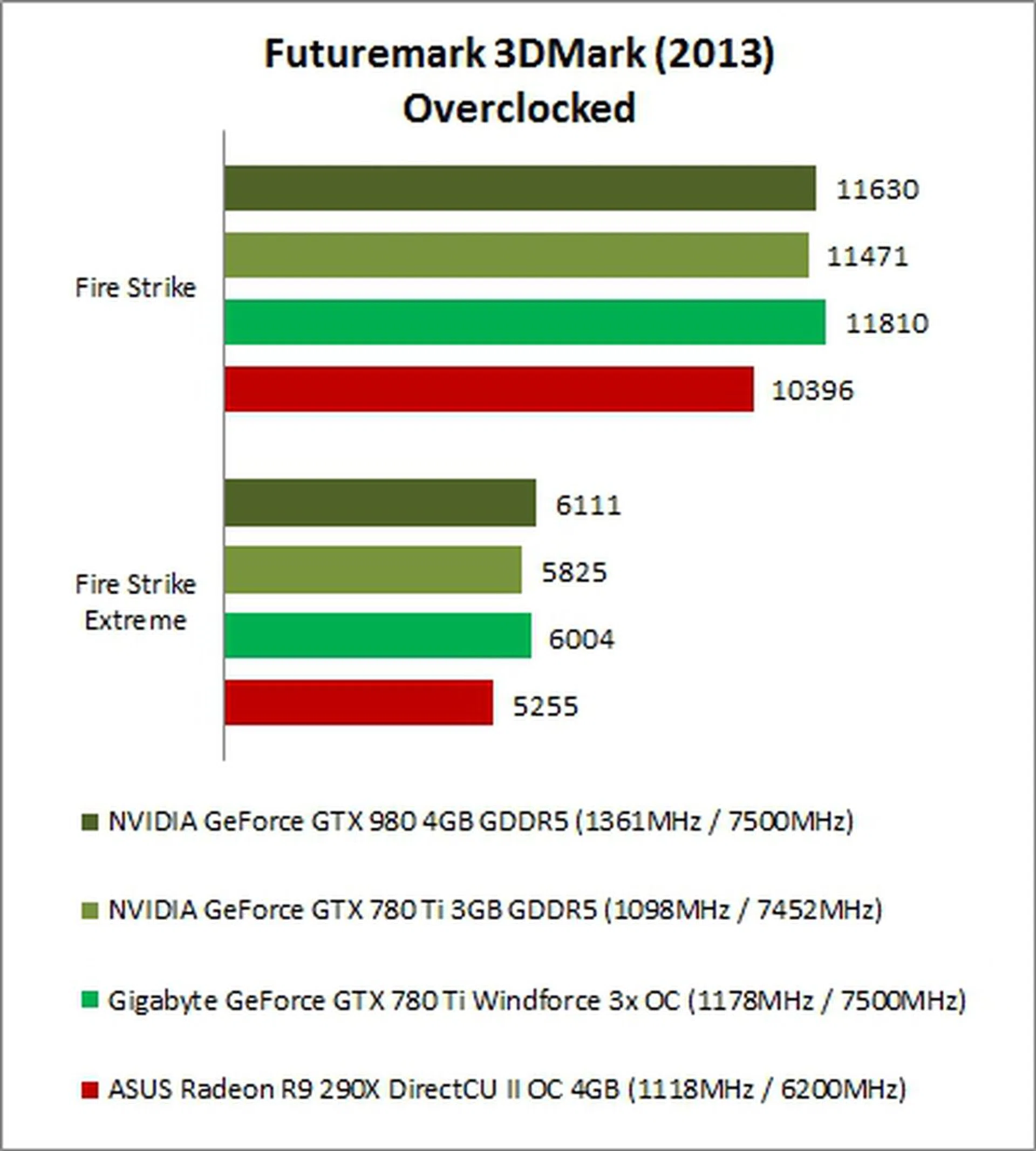 In this overclocked state, the GTX 980 managed to beat the Gigabyte 780 Ti at the Fire Strike Extreme tests, and against the ASUS R9 290X, it managed to outclass its AMD rival on all fronts. According to our test results, the performance gain from overclocking averaged at about 11%. In comparison, the overclocked GTX 780 Ti had an average gain of approximately 20%, the Gigabyte card gained about 8.5% when overclocked, and the overclocked ASUS Radeon R9 290X experienced an average gain of 5.5%.