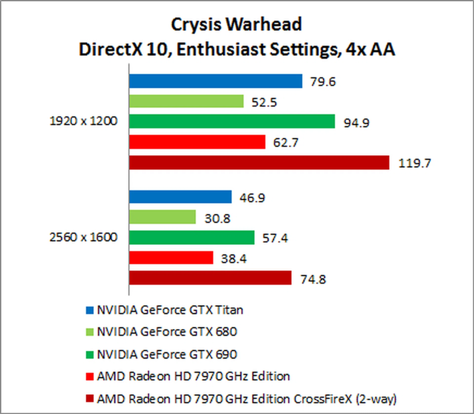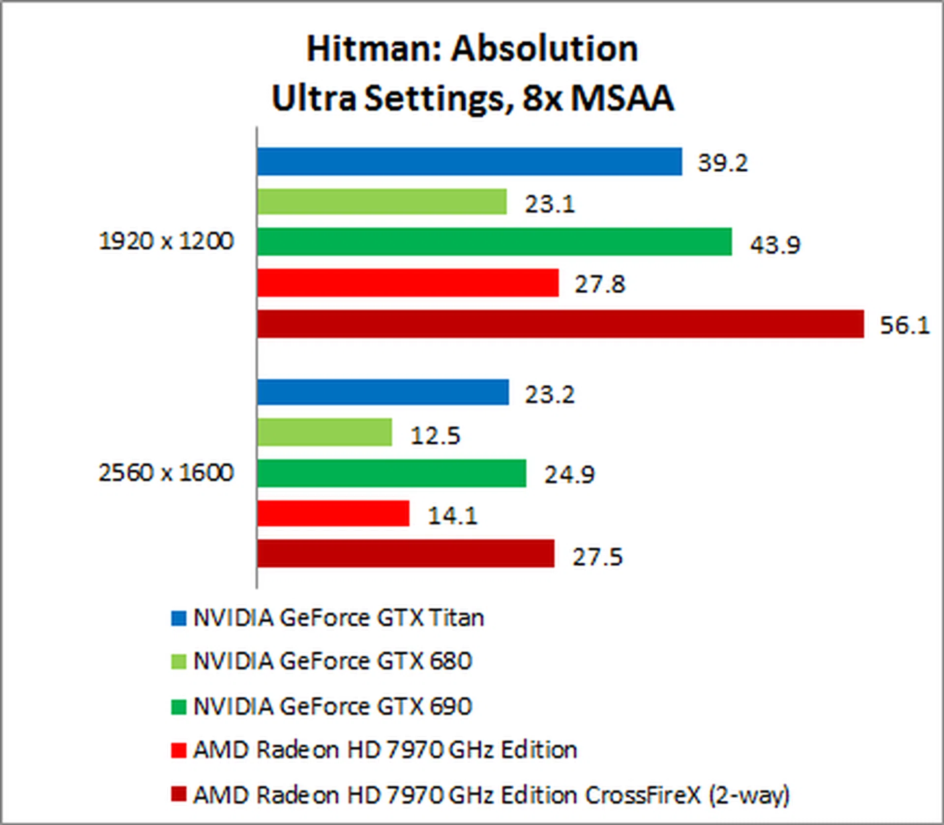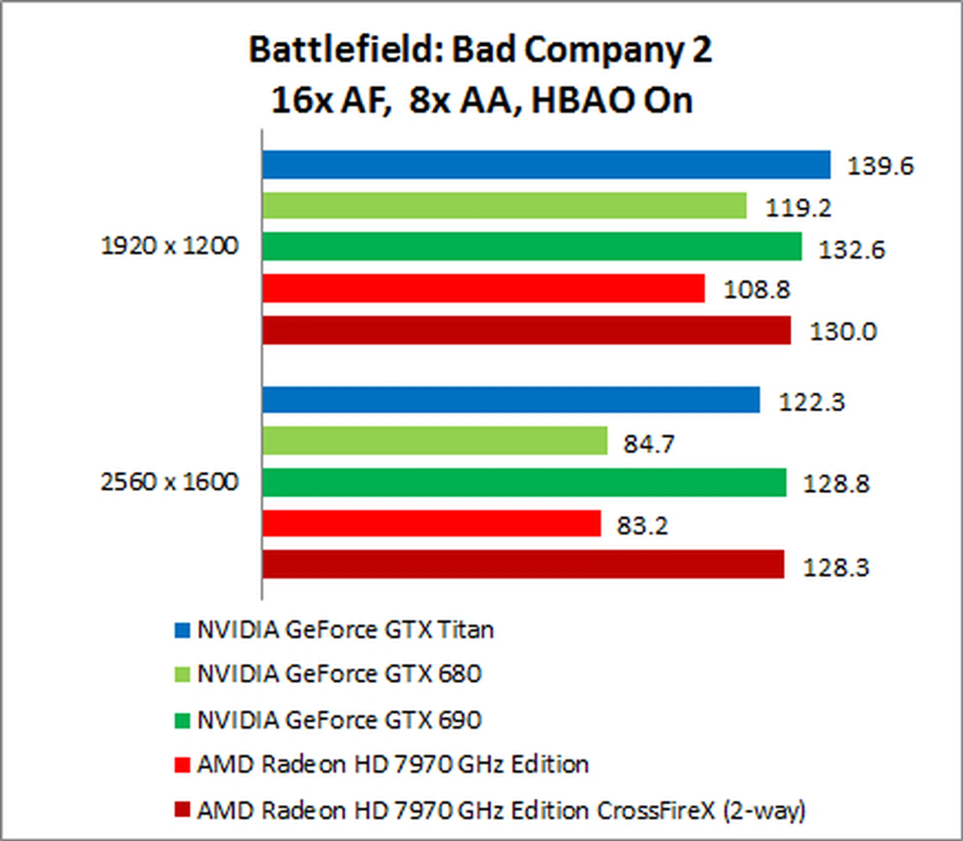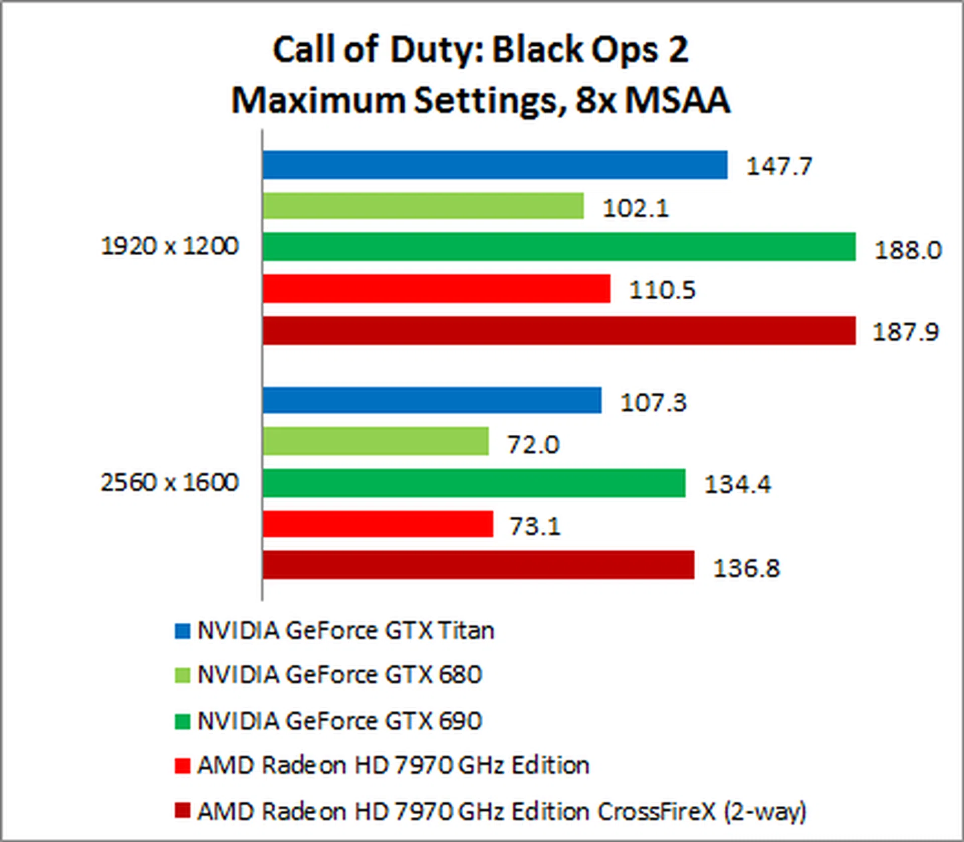 Black Ops 2 saw the GTX Titan return to form, outperforming the GTX 680 once again by 60% while trailing the GTX 690 by about 20%. As was the case with previous games where the GTX Titan scored over 100FPS, actual in game experience was indistinguishable between it and the two dual-GPU setups.