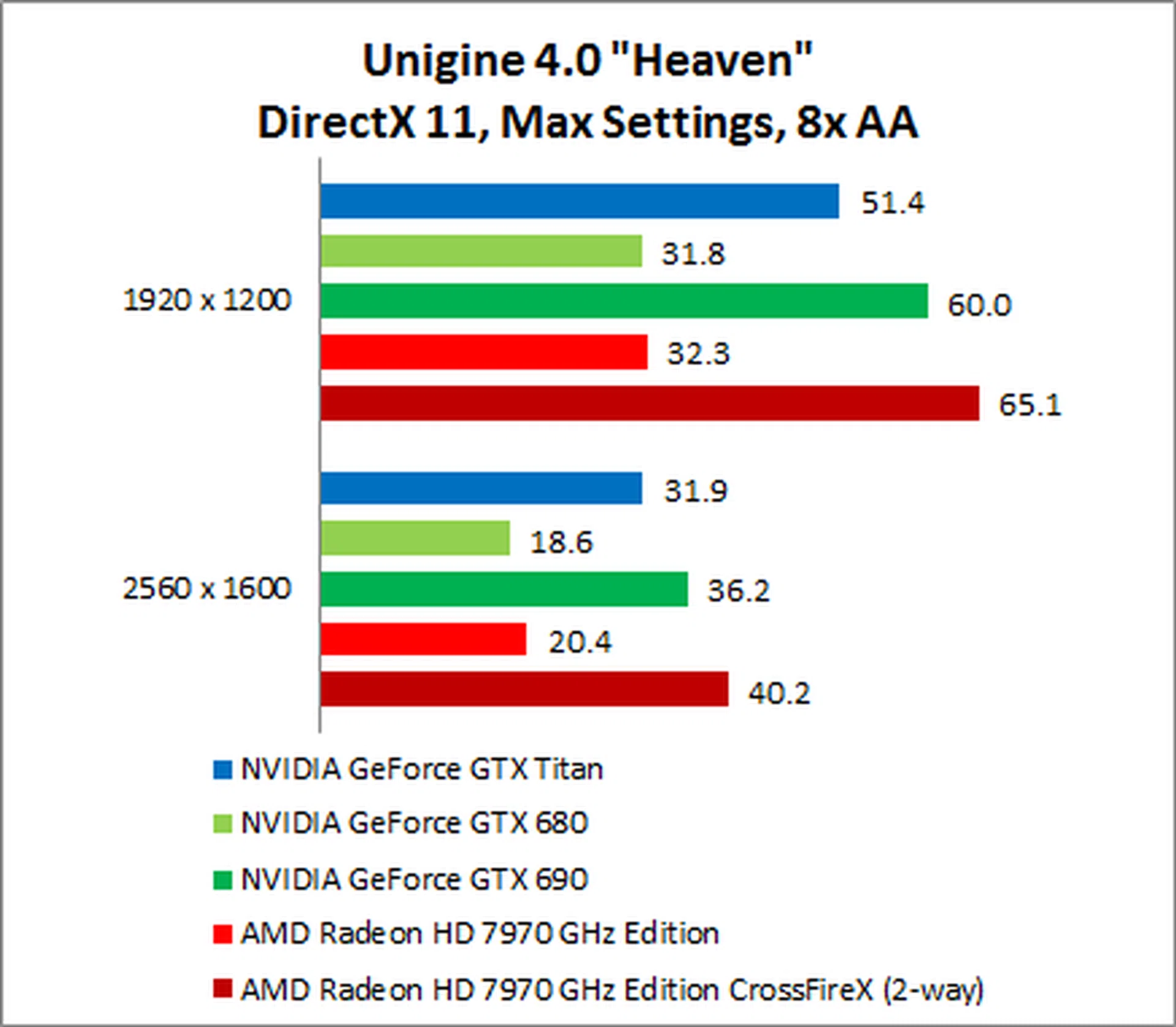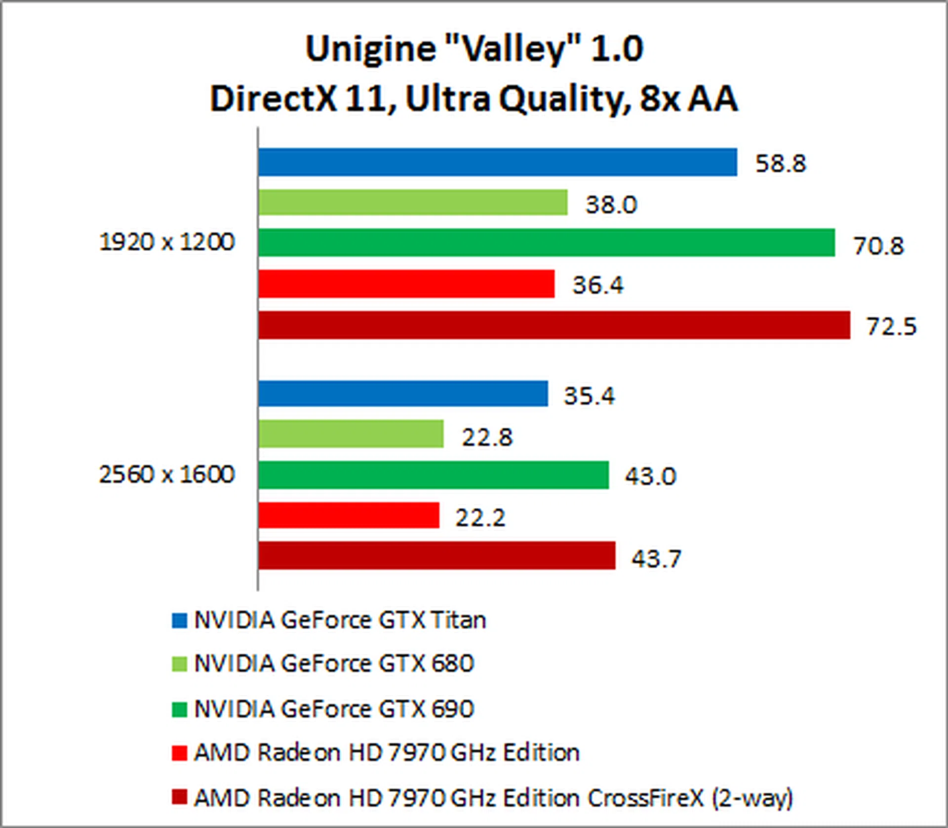 We saw a similar result to "Heaven" with the Titan performing about 60% better than the GTX 680 and HD 7970 GHz Edition while trailing the GTX 690 and HD 7970 GHz Edition CrossFireX setup by about 15-20%.