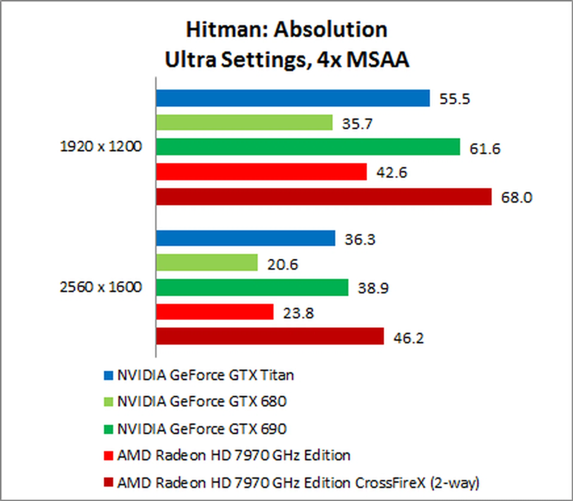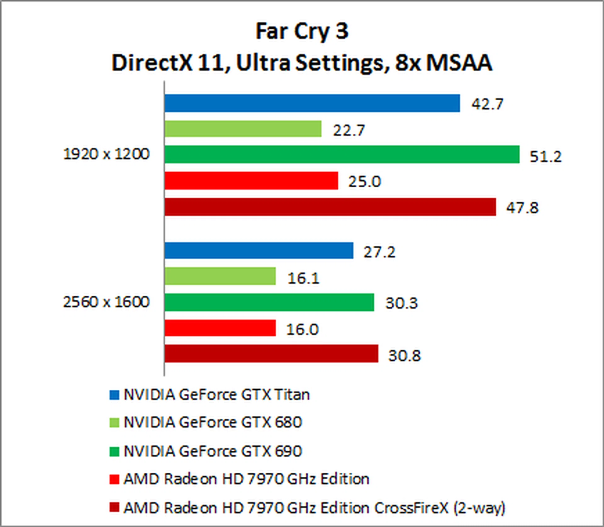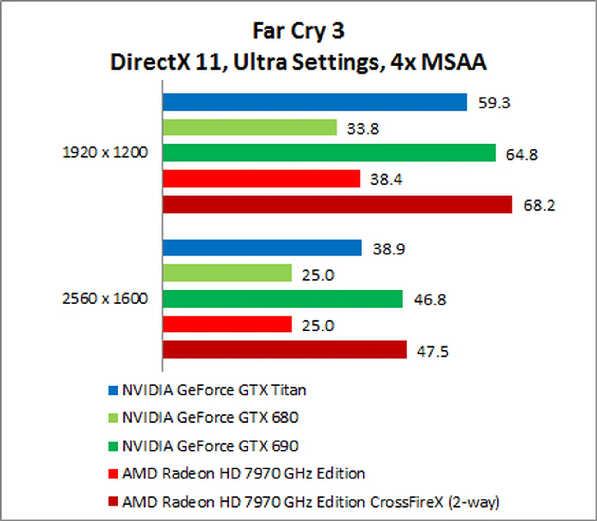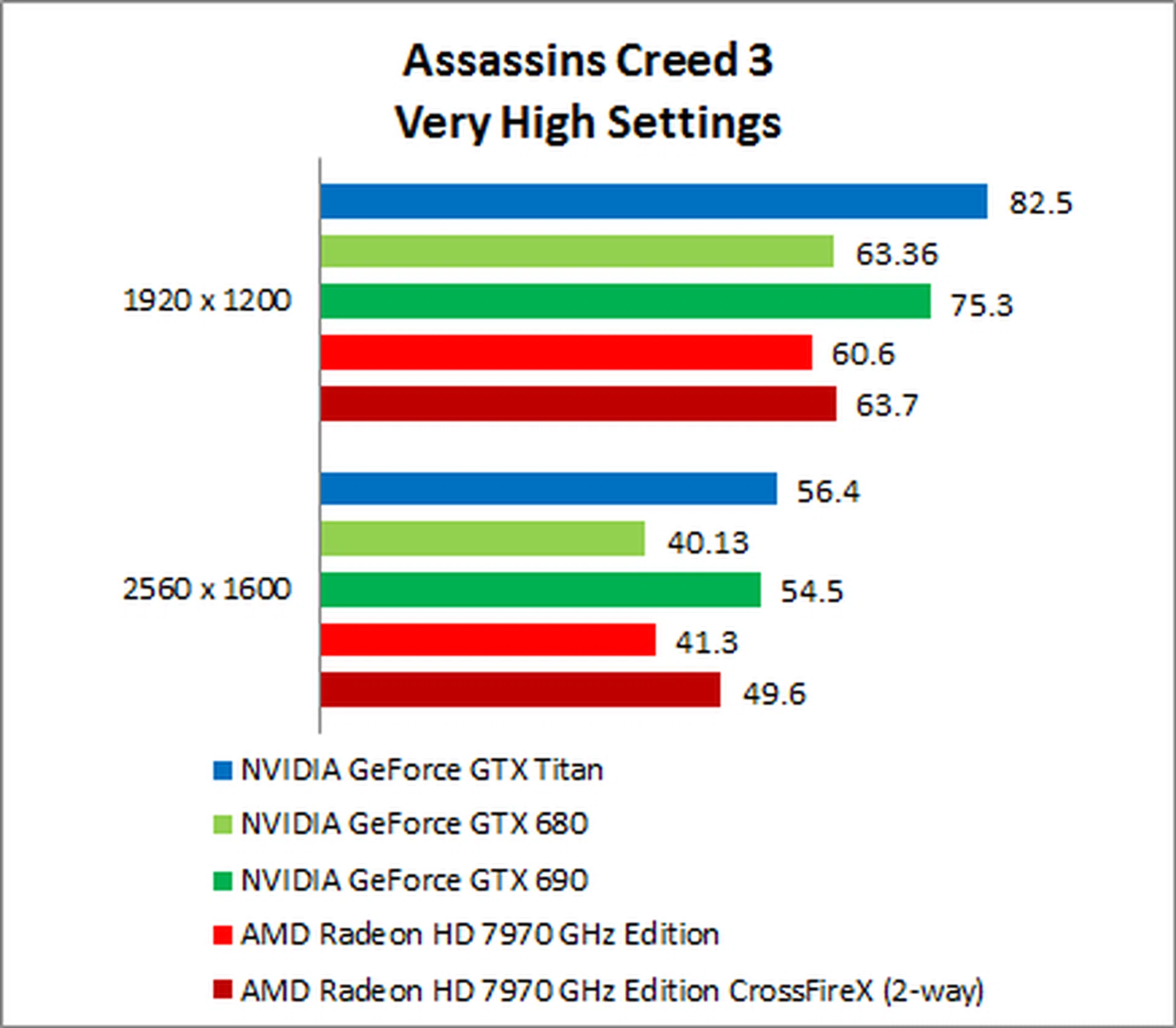 Surprisingly, the GTX Titan came out tops in Assassin's Creed 3, however we suspect that this is largely due to optimization issues with dual-GPU cards running this game. Even with newer drivers, we suspect some of those optimization issues may still linger as the GTX Titan underperformed compared to previous games, scoring only about 30% better than the GTX 680.