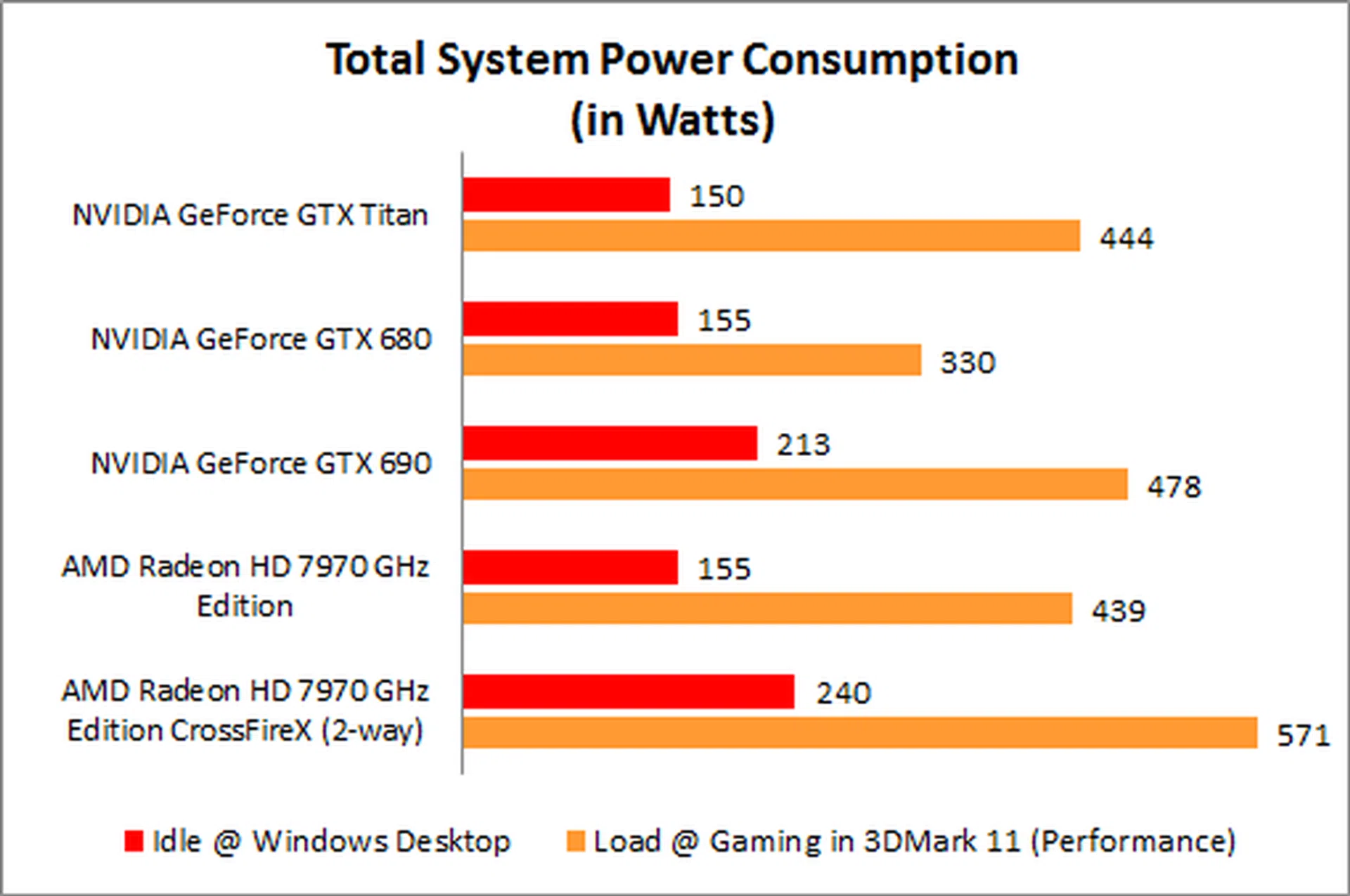 The GTX Titan showed quite high power consumption, on par with AMD's Radeon HD 7970 GHz Edition. In fact, at load it drew only 7% less power than the dual-GPU GTX 690 which was quite alarming for a single GPU card. While it may seem unsettling when compared against the NVIDIA camp of cards, it's still in positive light when compared to the AMD camp of cards.