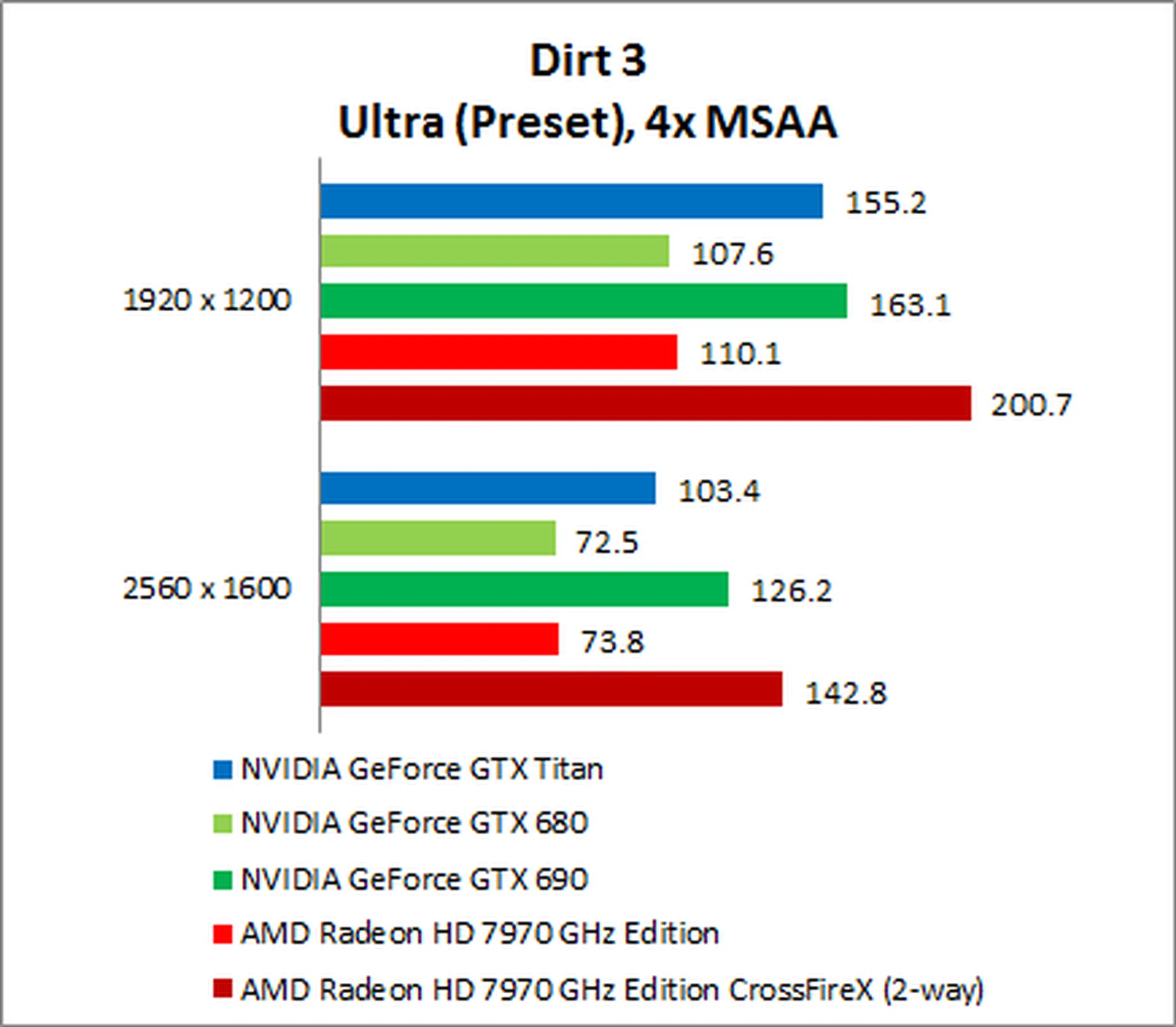 We saw similar results in Dirt 3 with the Titan outperforming the single-GPU cards and trailing slightly behind the dual-GPU setups, but again with virtually no distinguishable difference between them in terms of actual user experience.