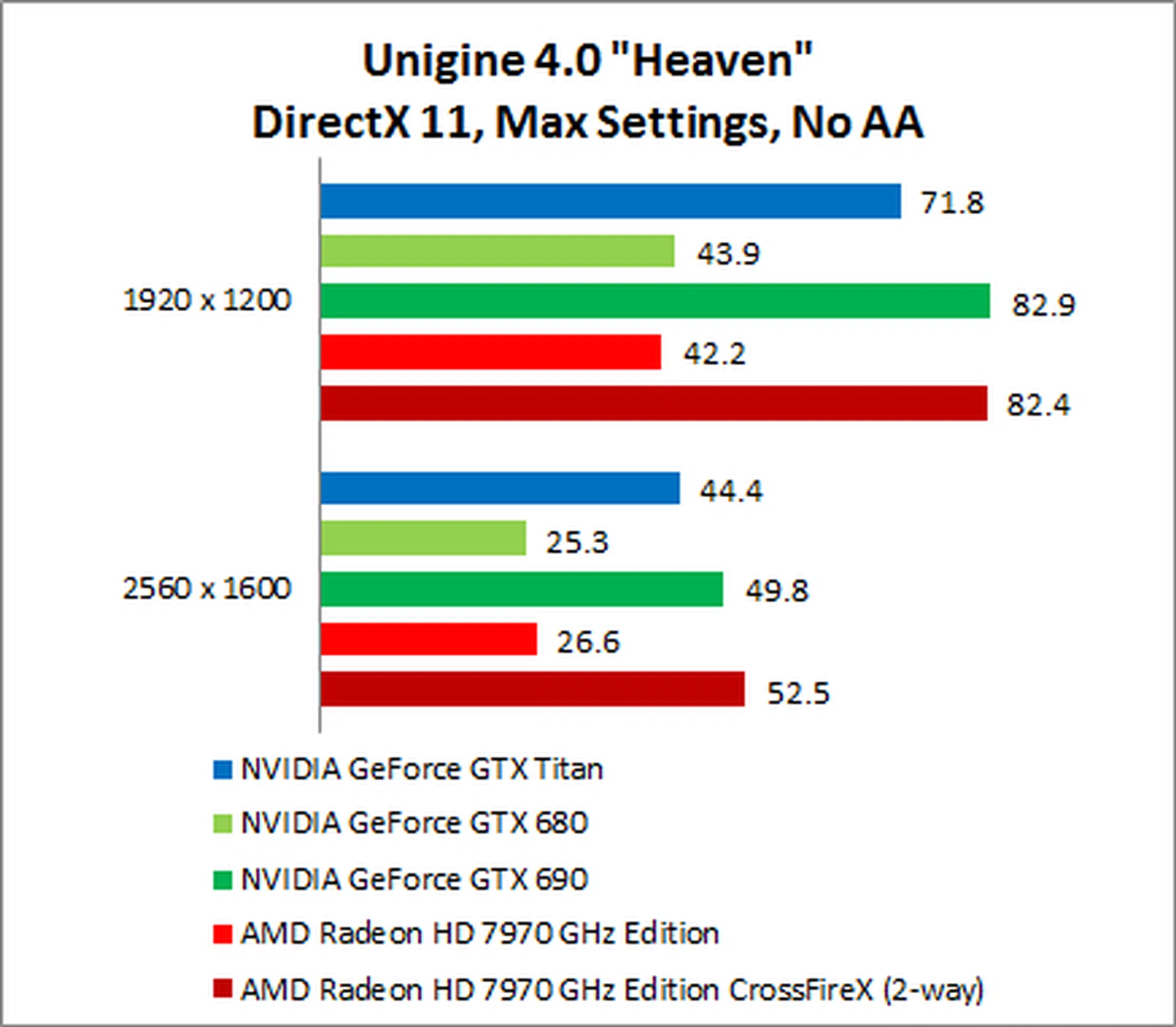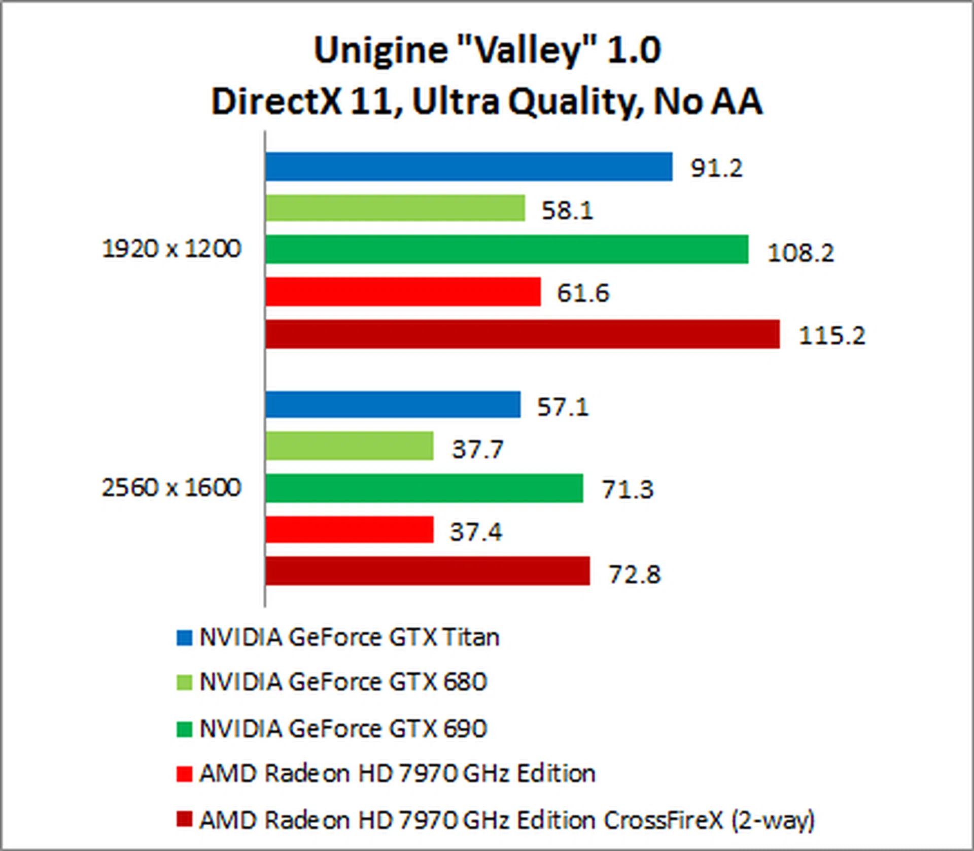 The GTX Titan was extremely impressive at the 1920 x 1200 resolution, outscoring the GTX 680 by a huge 73% while trailing the GTX 690 by just 8%. At a resolution of 2560 x 1600 pixels, it still performed well, continuing to outscore the GTX 680 by more than 70%, but fell about 18% behind the GTX 690 and 37% behind the HD 7970 GHz Edition CrossFire setup.