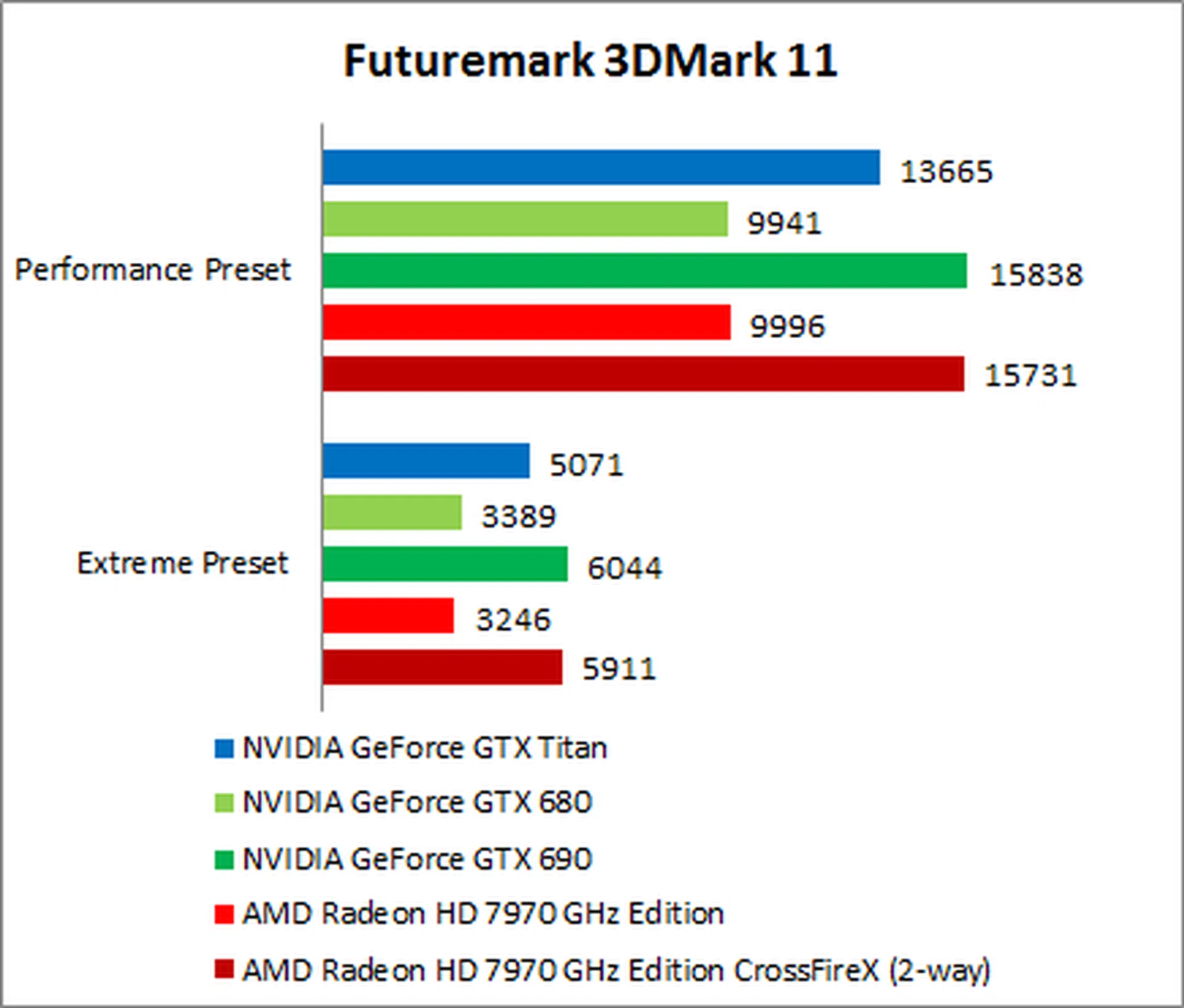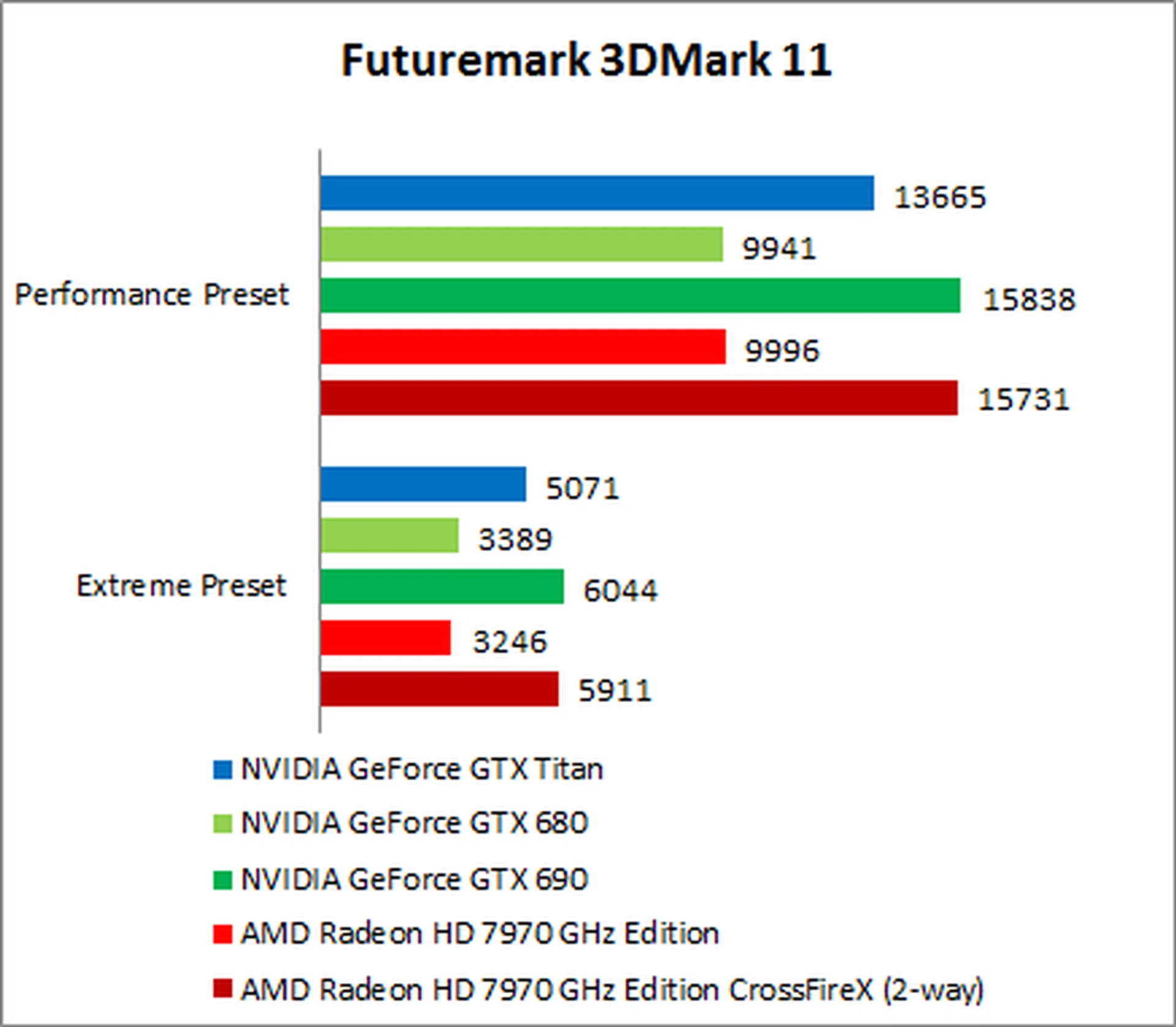 The Titan wasted no time in showing its prowess, outperforming the GTX 680 by 37% on Performance and an incredible 50% on Extreme. We were impressed by just how close the Titan is to dual-GPU level performance, as it trailed the GTX 690 by just 16% at Performance and 19% at Extreme.