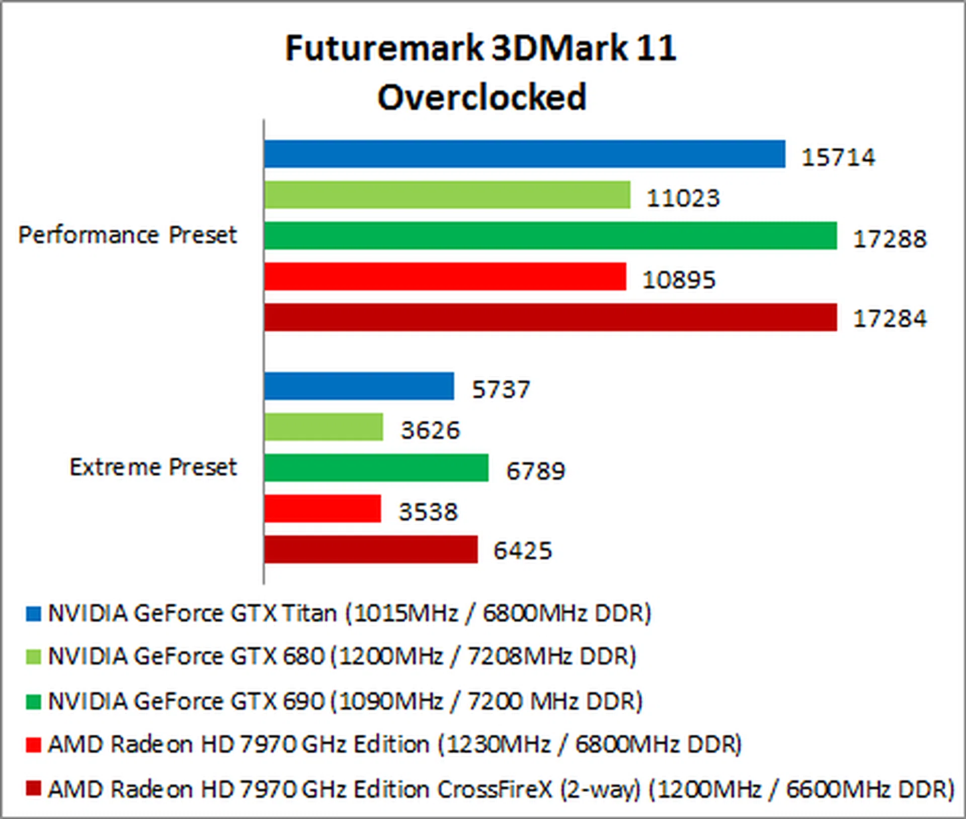 The GTX Titan was quite easy to overclock and for our efforts we were able to raise core clock speed to 1015MHz and memory to 6800MHz DDR. This resulted in a hefty 15% performance gain on Performance and 13% at Extreme on 3DMark 11, which put the GTX Titan very close to the performance of a reference GTX 690.