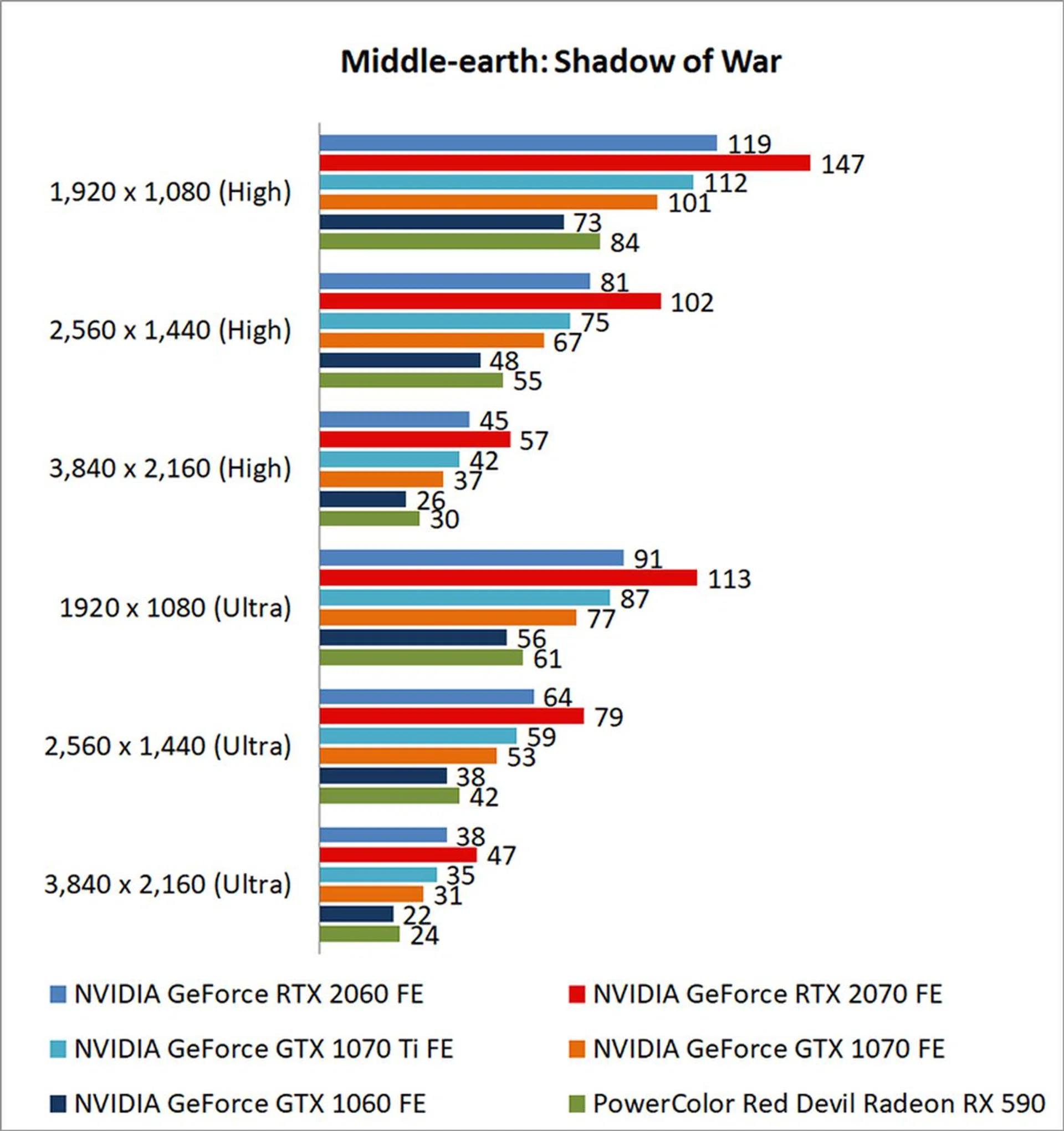 In Shadow of War, NVIDIA's latest Turing card once again proved itself very capable at 1080p and Ultra settings. It might have been roughly 21 per cent behind the GeForce RTX 2070, but it still handily beat the GeForce GTX 1070 and 1060 by 16 per cent and 47 per cent respectively.