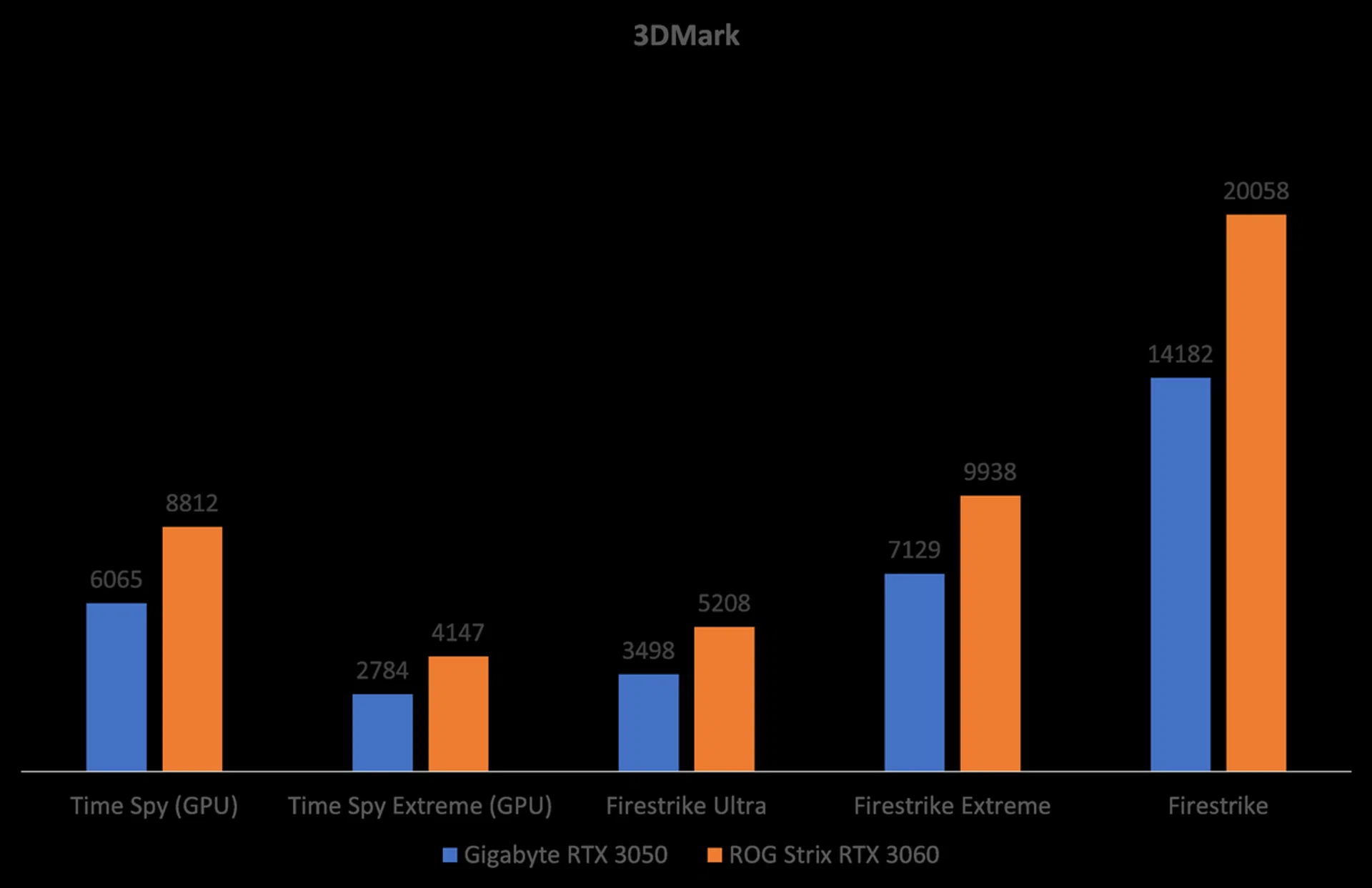 For the DirectX 11 Firestrike tests, the RTX 3050 expectedly falls well behind the RTX 3060. The same holds true in the DirectX 12 TimeSpy tests where it's up to 30% slower than then RTX 3060. But a synthetic benchmark like 3Dmark doesn’t always quite tell the whole story of a GPU. Especially when they are not of the same class, nor test the same way a real-world game is programmed. Let's look at some real-world numbers.
