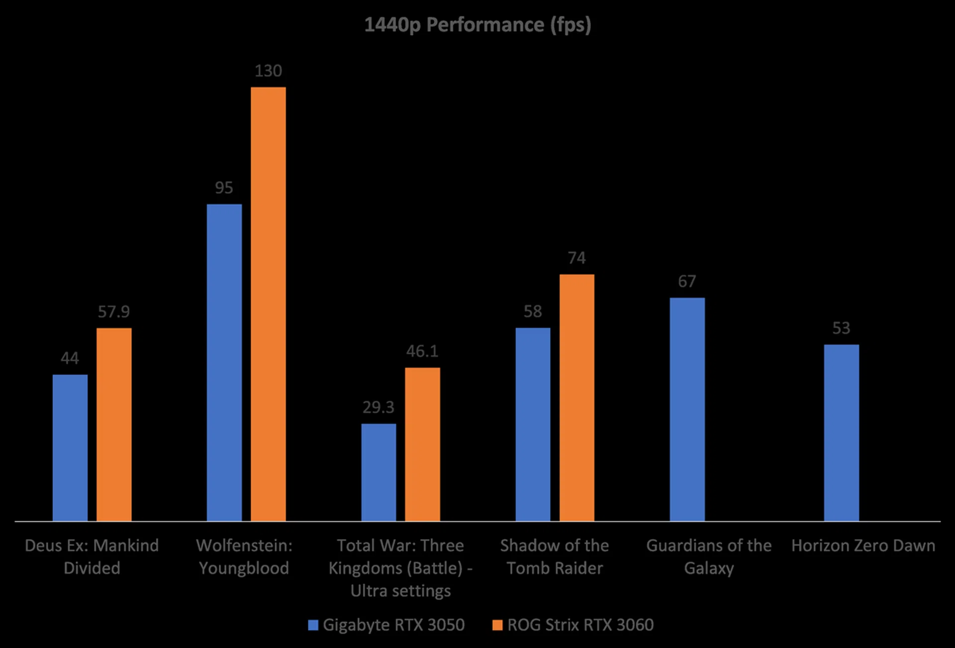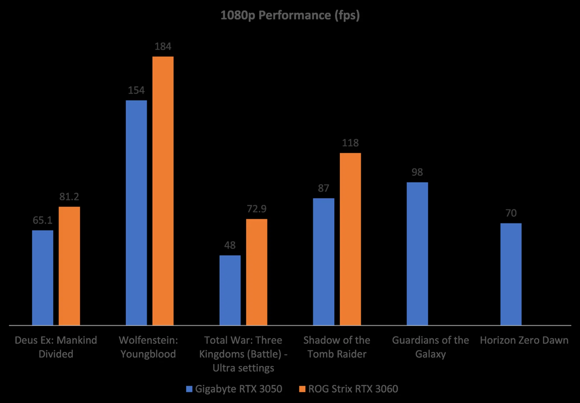 At 1080p, the RTX 3050 seems to be able to hold up well with shooter games like the Vulkan-based Wolfenstein: Youngblood and the DirectX-based Guardians of the Galaxy and Shadow of the Tomb Raider. Raw numbers aside, the relative performance difference to an RTX 3060 is between 20% to 25%. It does, however, wavers a little with open-world based games such as Deus Ex: Mankind Divided and Horizon Zero Dawn, and falls completely at resource-intensive strategy games like Total War: Three Kingdoms. It’s also worth noting that the RTX 3060 ran all of these games with utmost ease at 1080p (I didn't have the card to test with Guardians and Horizon at the time of writing).