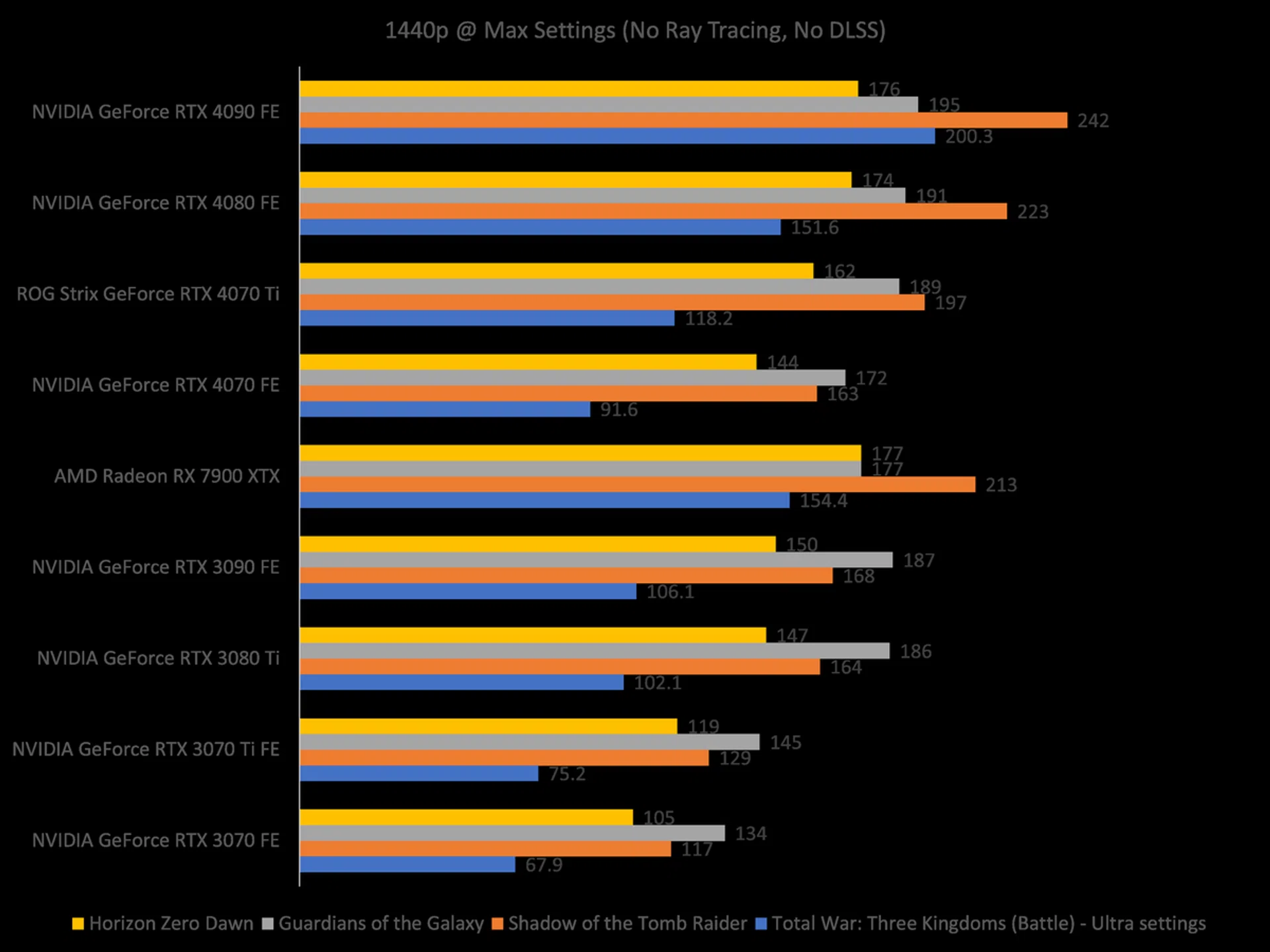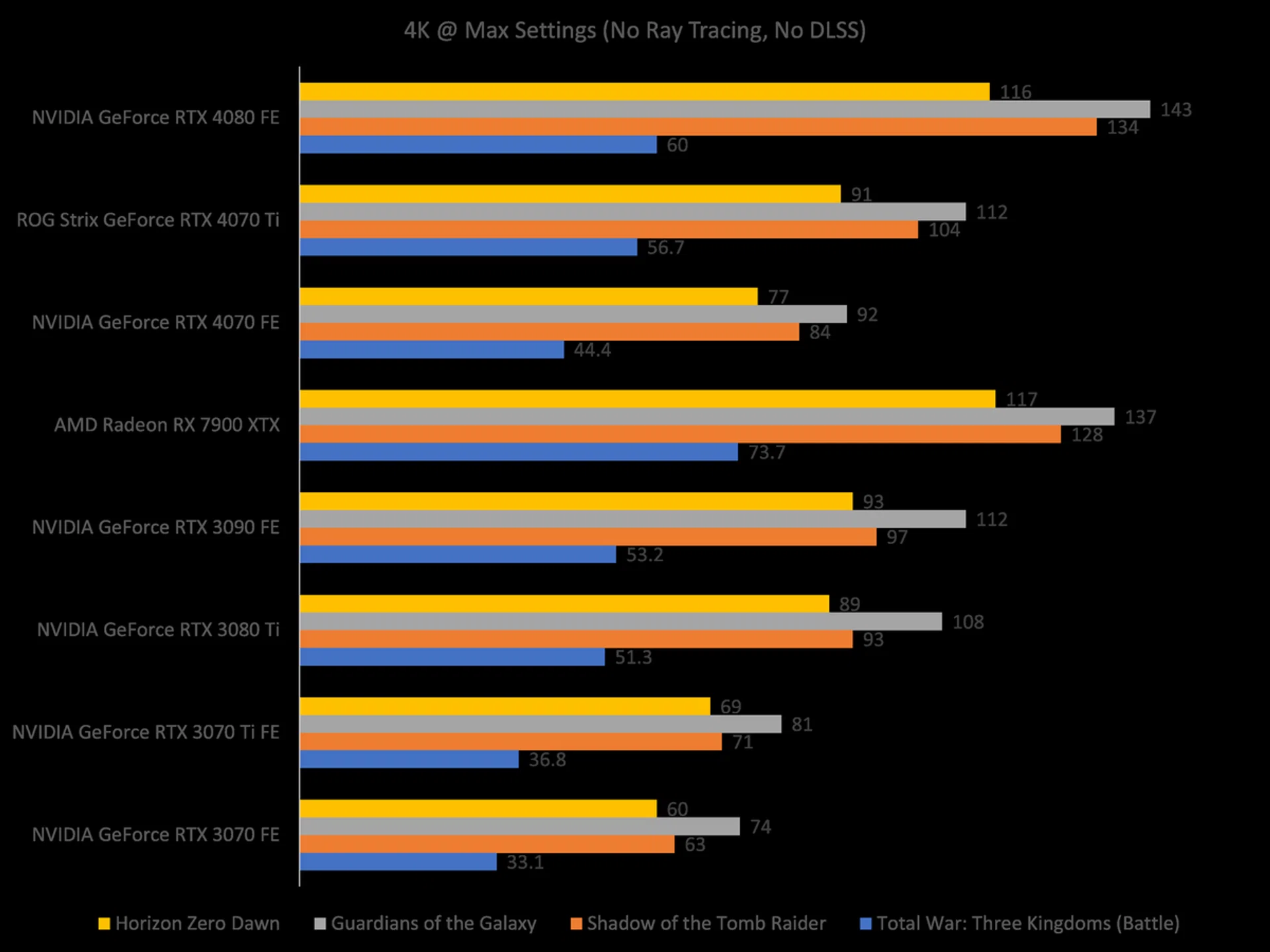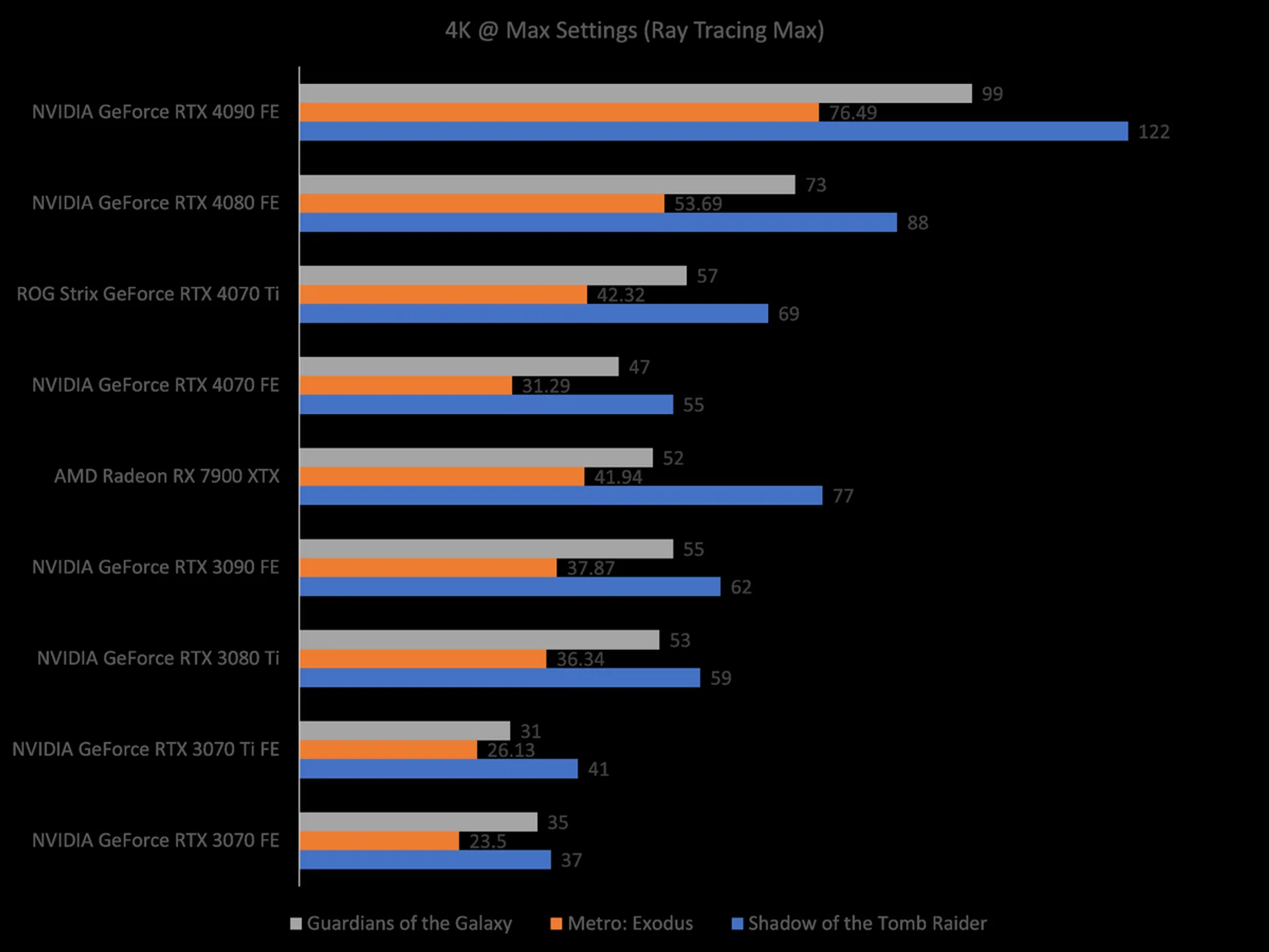 Apart from the three existing RTX 40 series cards, I have also compared the 4070 with the previous-gen RTX 30 series cards. This will give us some clarity on how the 4070 performs gen-to-gen against its predecessor, the GeForce RTX 3070 Founders Edition. I have also included AMD's flagship Radeon RX 7900 XTX to add some spice into the competition.