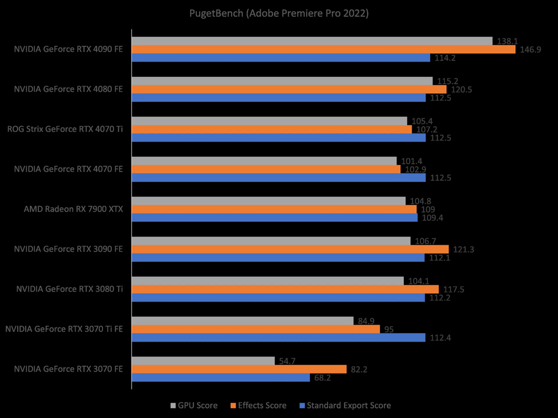 It's not just games where the RTX 4070 surpasses its RTX 30 series predecessors. For content creations, the GPU is a marked upgrade to not just the RTX 3070 Ti and RTX 3070, but in Adobe Premiere Pro, the RTX 4070 is only just a hair behind the RTX 3080 Ti.