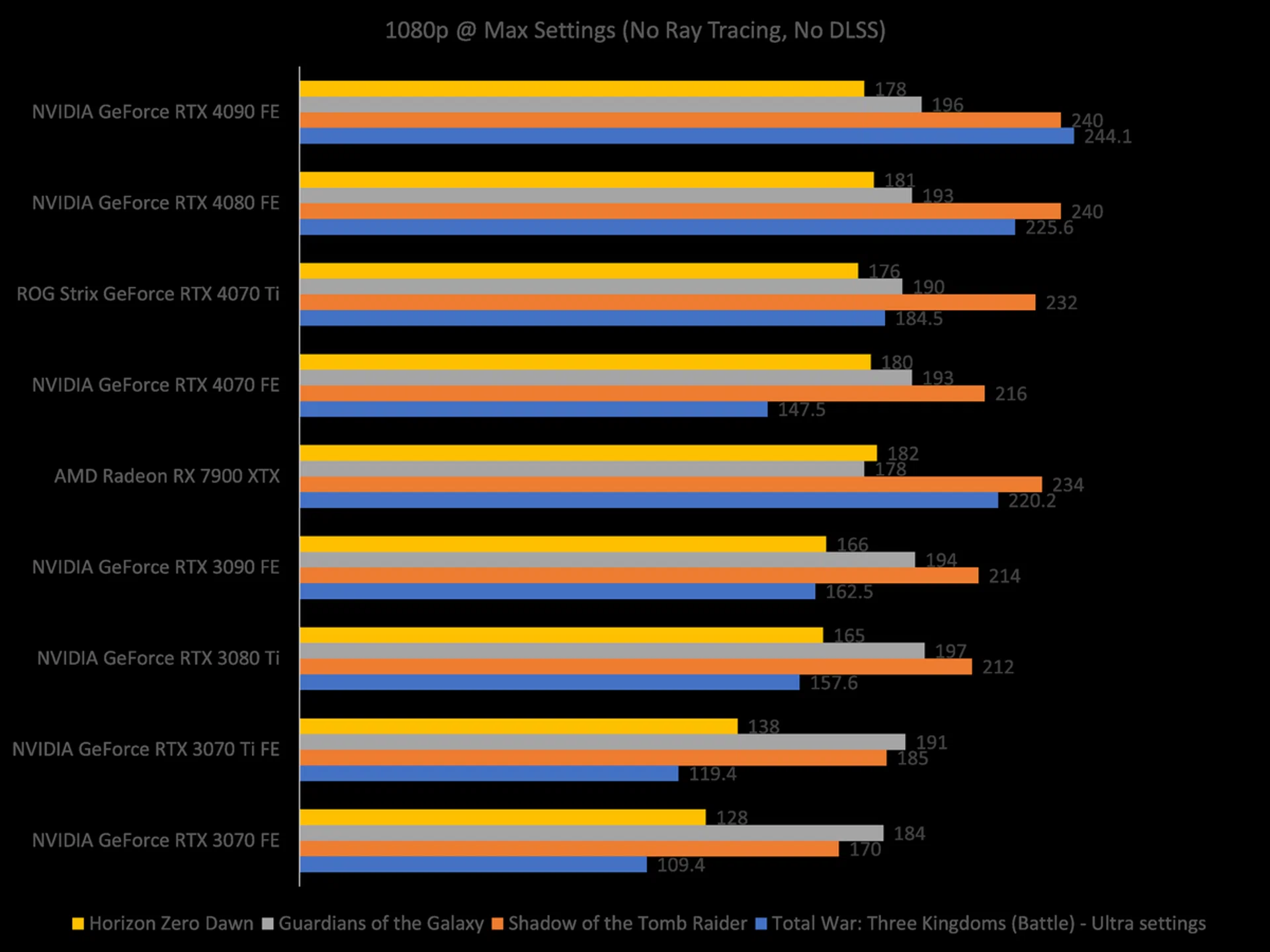 At 1080p, the RTX 4070's performance pretty much matches up to its more powerful RTX 40 series siblings, except in RTS games like Total War: Three Kingdoms, where the GPU has to render tons of units in the battle map. With such games, a higher-end GPU will be more beneficial, and even more so at higher resolutions.