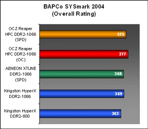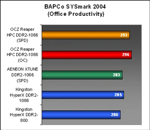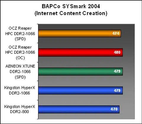 SYSmark 2004 was another productivity benchmark that the OCZ Reaper HPC memory seemed to shine in. While we didn't notice much of a difference in the Internet Content Creation workload, Office Productivity saw a decent jump in performance, gaining a 3% improvement over the Kingston and AENEON memory and a little over 4% when overclocked with faster timing. These scores helped the memory attain higher overall results as well.