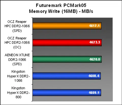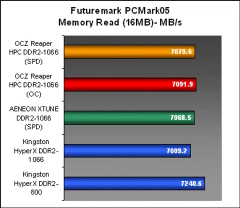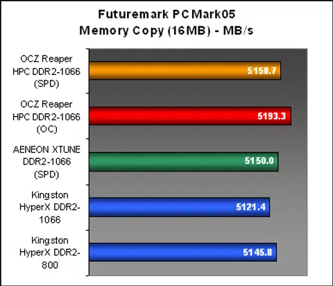 CPU performance results from both AquaMark3 and 3DMark06 offer further proof that the OCZ Reaper HPC really is that good. Even if you only take the stock SPD timings into consideration, there was a visible difference in memory subsystem performance over the AENEON XTUNE and Kingston HyperX DDR2-1066 modules.