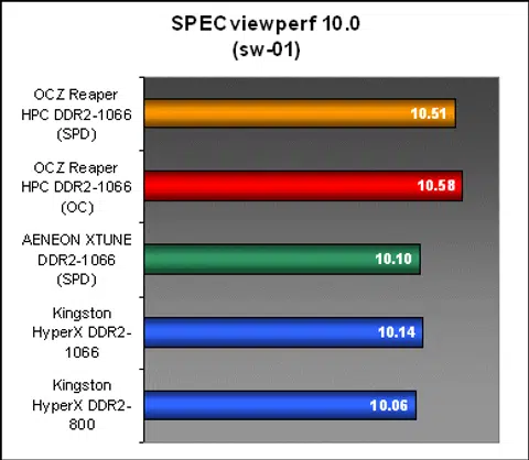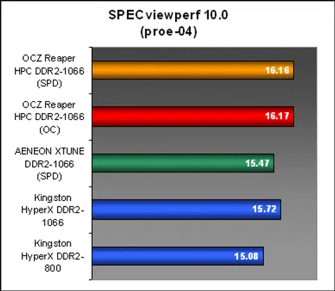 After its performance on PCmark05 and SYSmark2004, we weren't all surprised by the OCZ Reaper's results in SPECviewperf 10 anymore. Again, the memory managed to outperform similar speed memory by an average of about 3-4% depending on how you further tweak its timings.