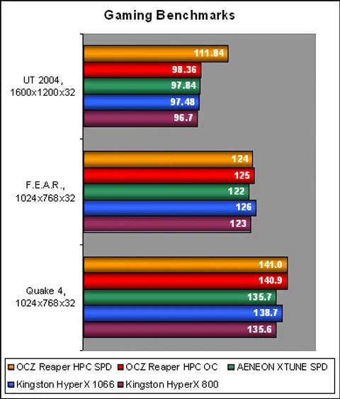The OCZ Reaper HPC also managed to squeeze out a few more frames from Quake 4 when compared with the rest of the competition. However, there were little to no difference between the SPD and OC timings this time around. F.E.A.R. was the only benchmark that the OCZ Reaper HPC memory did not maintain a lead. The honors went to the Kingston HyperX DDR2-1066, but that 1fps difference shouldn't be missed.