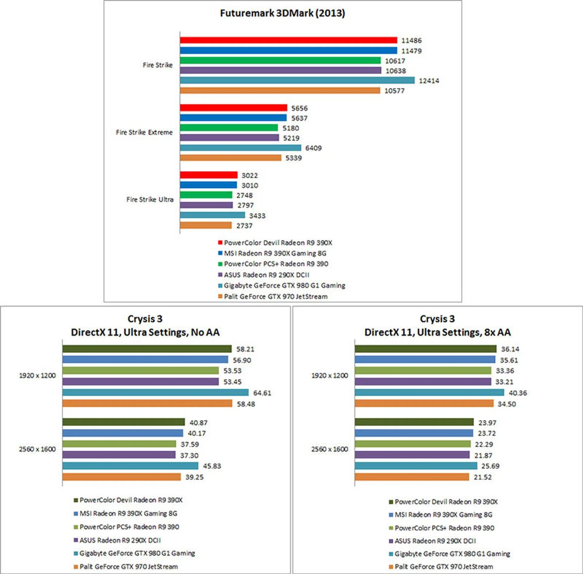 As expected, the difference between the PowerColor Devil and the MSI card in Crysis 3 amounts to just over a single frame at most. You’re definitely not going to notice the difference in-game. These results come as no surprise, and the slight speed bump the PowerColor Devil has over the MSI Radeon R9 390X is indeed too minuscule to result in a tangible difference.