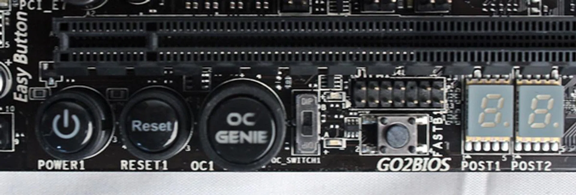 As we move beyond the last PCIe x16 expansion slot to the bottom edge of the motherboard, we locate the three onboard control buttons (Easy Button 3); they have been moved from their usual position near the DIMM slots to their new current position. Compared to their older counterparts such as the MSI Z77A-GD65 Gaming board, the new position is a slight improvement but not any more inconvenient once the board is installed within a chassis. As long the third PEG slot remains unused (which is quite likely), these controls remain accessible. The OC Genie button now activates the OC Genie IV feature of the board that essentially still provides a one-touch overclocking solution; however, this feature has been updated to work in tandem with a DIP switch next to the OC Genie button that controls the OC Genie's overclocking mode.