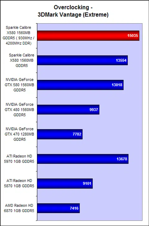 The lower operating temperatures also helped it achieve a higher overclocking state compared to a reference card. After disabling the GeForce GTX 580’s auto throttling safety mechanism that prevents the chip from overheating, we managed to attain a maximum overclocking state, giving us 15035 3DMarks - a healthy improvement of 10%.