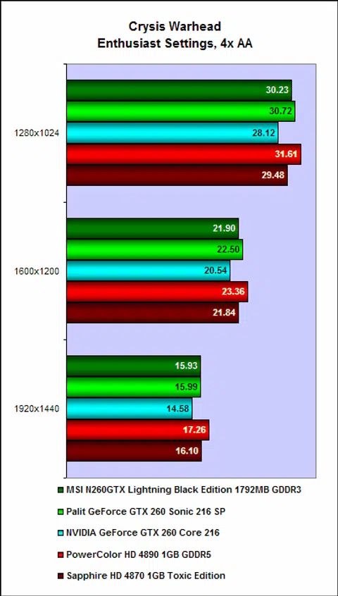 Moving on to Crysis Warhead and it was still nip and tuck between the MSI N260GTX Lightning and the Palit GeForce GTX 260 Sonic 216 SP, with less than one FPS difference between the two - in fact it could just be driver version differences. However, there was no denying that the best performer here is ATI's Radeon HD 4890, who was markedly faster especially with 4x anti-aliasing enabled.