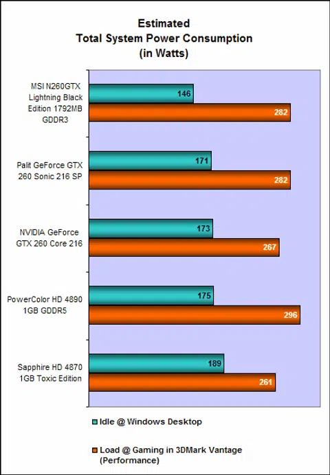 The MSI N260 Lightning recorded a peak power draw of 282W, similar to the Palit GeForce GTX 260 Sonic 216 SP and not too far off the Radeon HD 4890. It just goes to show that despite driver optimization, a powerful card will still draw bucket loads of power. Fortunately, at idle, the system was recording a power draw of 146W, which is the lowest here.