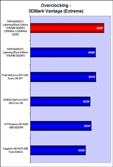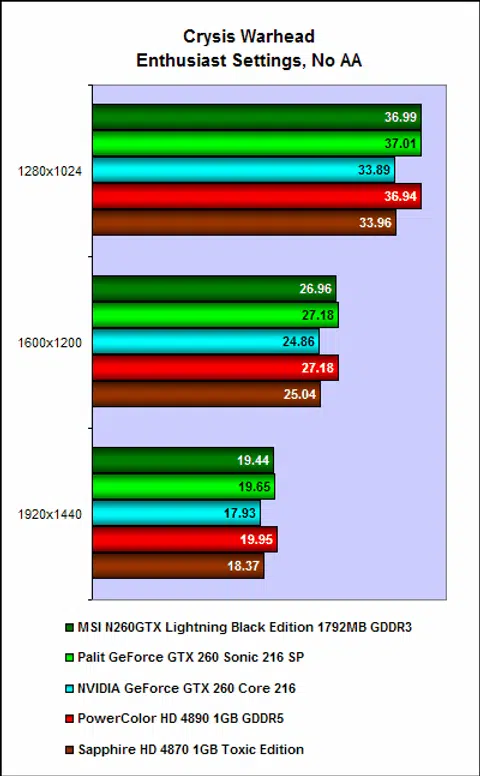 The MSN N260 Lightning once again performed as fast as the Palit GeForce GTX 260 Sonic 216 SP, and it was significantly faster even than a reference NVIDIA GeForce GTX 260 Core 216. It was also a smidge faster than ATI's newest Radeon HD 4890.