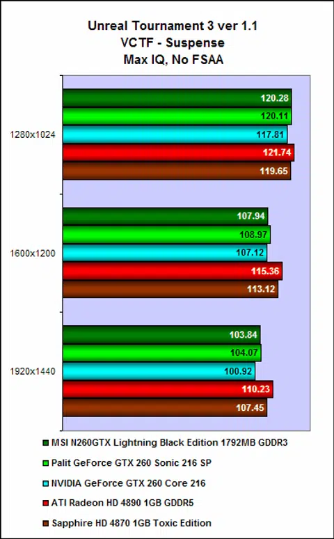 Not unsurprisingly, the two cards' performance remained equal up till our last benchmark, Unreal Tournament 3. All in all, it seems that the higher core clock speeds of the MSI N260GTX Lightning have been nullified by the faster memory clock speeds of the Palit card. And here on Unreal Tournament 3, we noticed that the Radeon HD 4890 is the fastest of the lot.