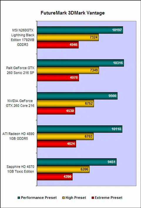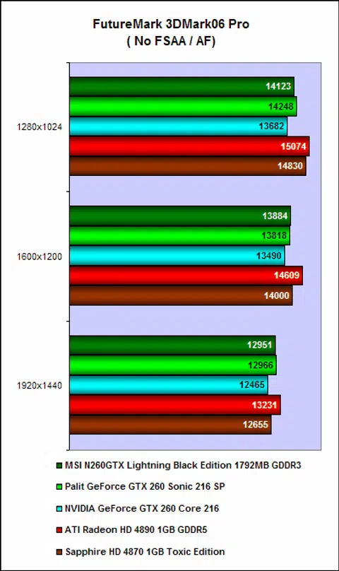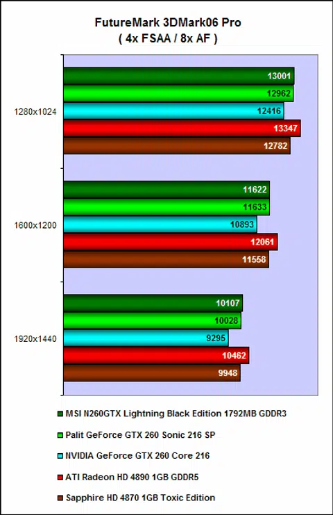 Beginning with 3DMark06, we can immediately see that the MSI N260 Lightning is as fast as the factory-overclocked Palit GeForce GTX 260 Sonic 216 SP, which is not surprisingly given that its clock speeds are only marginally faster. We also noted the cards from the red camp were the better performing cards for this round, if only by a little bit.