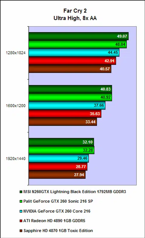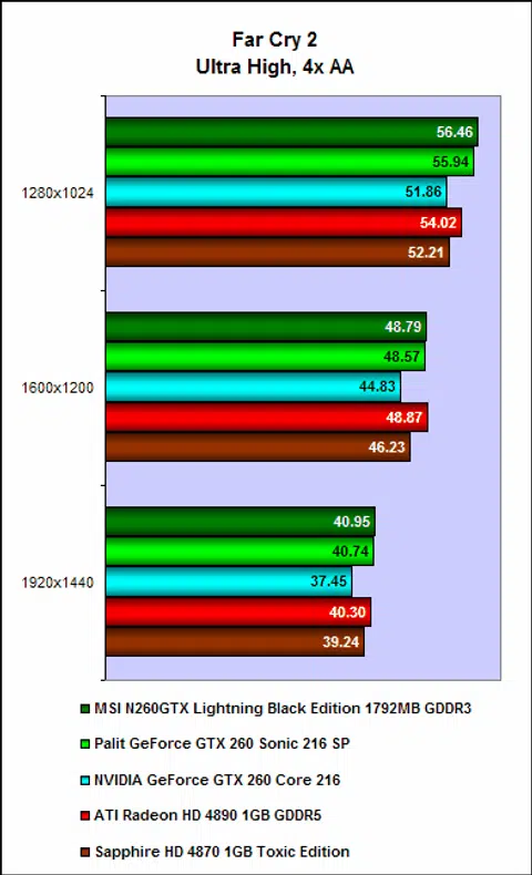 On Far Cry 2, the situation is reversed with the NVIDIA cards being the superior bunch. And not unsurprisingly, the MSI N260GTX Lightning continued to keep pace with the Palit card, with the difference between the two was as little as 0.09 FPS.