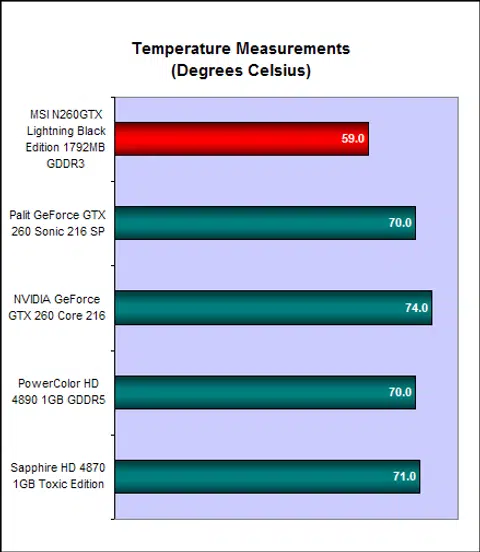 With the MSI N260 Lightning and Palit GeForce GTX 260 Sonic 216 SP both performing similarly in terms of sheer frame rates, this is where it gets interesting. Which is the cooler card? Thankfully, it's a no contest. The MSI N260GTX Lightning's Twin Frozr managed to keep things at a cool 59 degrees Celsius, which is impressive for a card bearing this GPU; whereas the Palit card could only manage 70 degrees Celsius. That's a remarkable difference of 11 degrees Celsius.