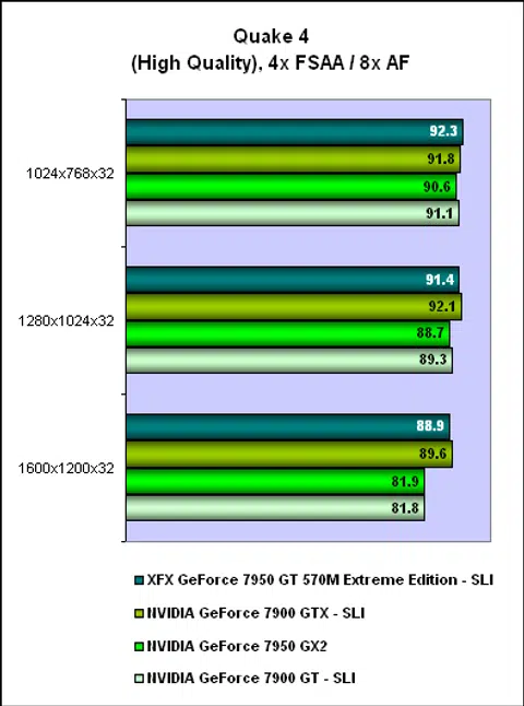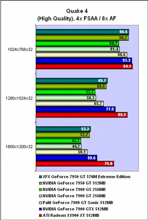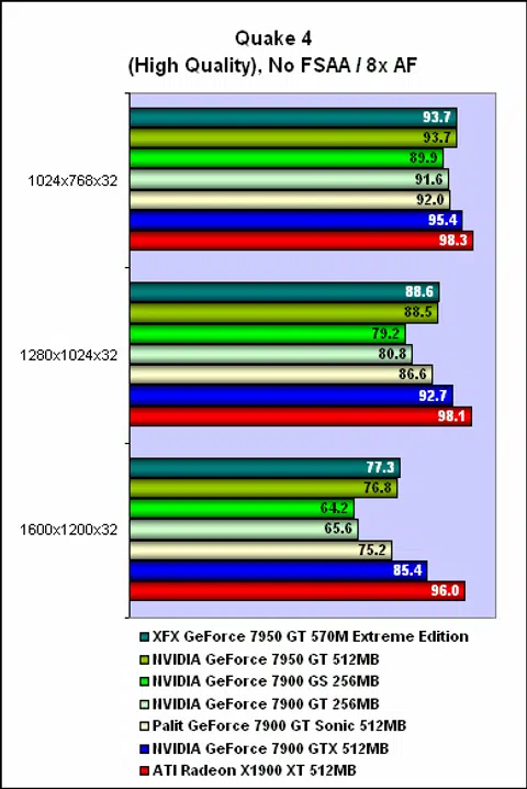 Finally, in Quake 4 we also failed to find a convincing case for the overclocking on the XFX GeForce 7950 GT 570M Extreme. The margins were razor thin between the XFX and the reference card and we doubt that anyone could discern between the two while in-game. Thanks to the incremental good work done by ATI, the Radeon X1900 XT 512MB was now the fastest card here in Quake 4, provided you have installed the latest Catalyst drivers of course.