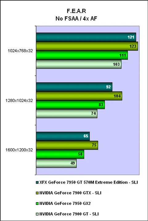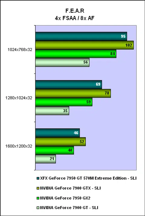 The SLI scores for F.E.A.R were quite predictable, following closely the trend we had observed in 3DMark earlier. The XFX SLI configuration was nicely sandwiched between the GeForce 7900 GTX SLI and GeForce 7950 GX2. Given the almost negligible improvement due to the overclocking, one may expect the XFX scores here to be very similar to that of a standard GeForce 7950 GT SLI setup.
