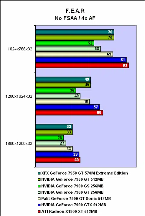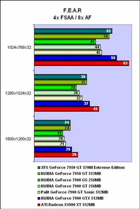 The minor improvement that we noticed in 3DMark was similarly observed in Splinter Cell. A single frame or less separates the two cards in all the resolutions tested and again the Radeon X1900 XT 512MB emerged as comfortable winners. F.E.A.R was representative of the ineffectual overclocking by XFX as for all but one resolution, the XFX was on par with the reference GeForce 7950 GT. If you are hoping for greatly improved performance, get a GeForce 7900 GTX instead.