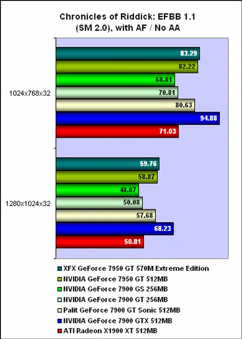 NVIDIA got back some of its pride in the OpenGL based Chronicles of Riddick as the Radeon X1900 XT performed quite woefully here. At best, the Radeon was on par with the GeForce 7900 GT, while XFX's overclocked GeForce 7950 GT ended up in second place behind the GeForce 7900 GTX, which had a clear lead. This game is probably one of the better examples of how ATI's recent driver optimizations seem to extend only to the bigger OpenGL titles like Quake 4 and not to all games using OpenGL. Again, the minute performance difference between the overclocked XFX and the standard GeForce 7950 GT is almost not worth mentioning.