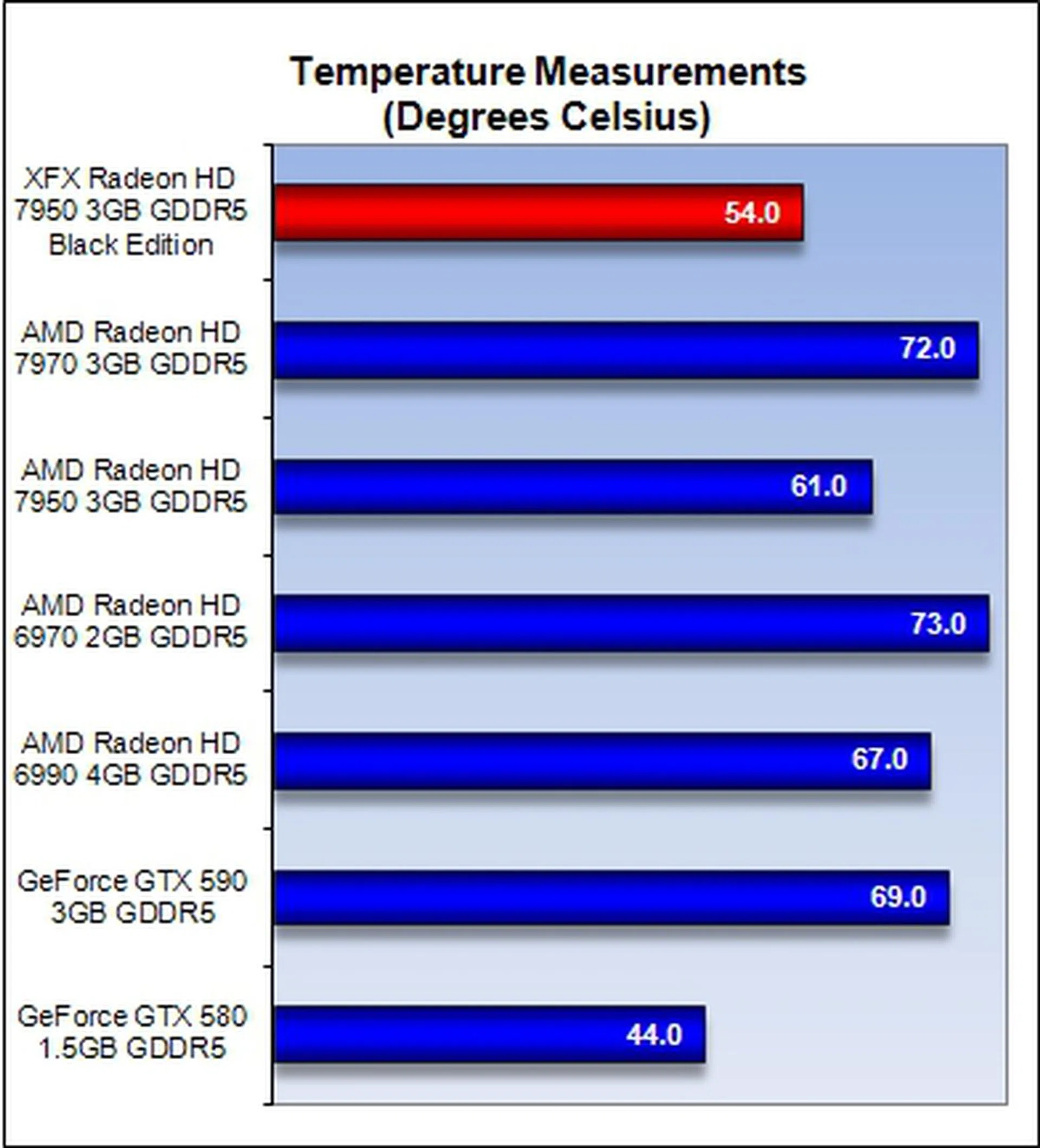 The Radeon HD 7970 recorded the second highest temperature of 72 degrees Celsius while XFX R7950 Black Edition Double Dissipation operates at a cool 54 degrees Celsius. Looks like the custom cooler is doing a great job. Our earlier misgivings with regards to the ill-aligned heatsink over the card's memory chips are somewhat alleviated with the good showing of the card on this test. Out of curiosity, we measured its temperature again when we overclocked the XFX card and its temperature was yet maintained at just 54 degrees Celsius!