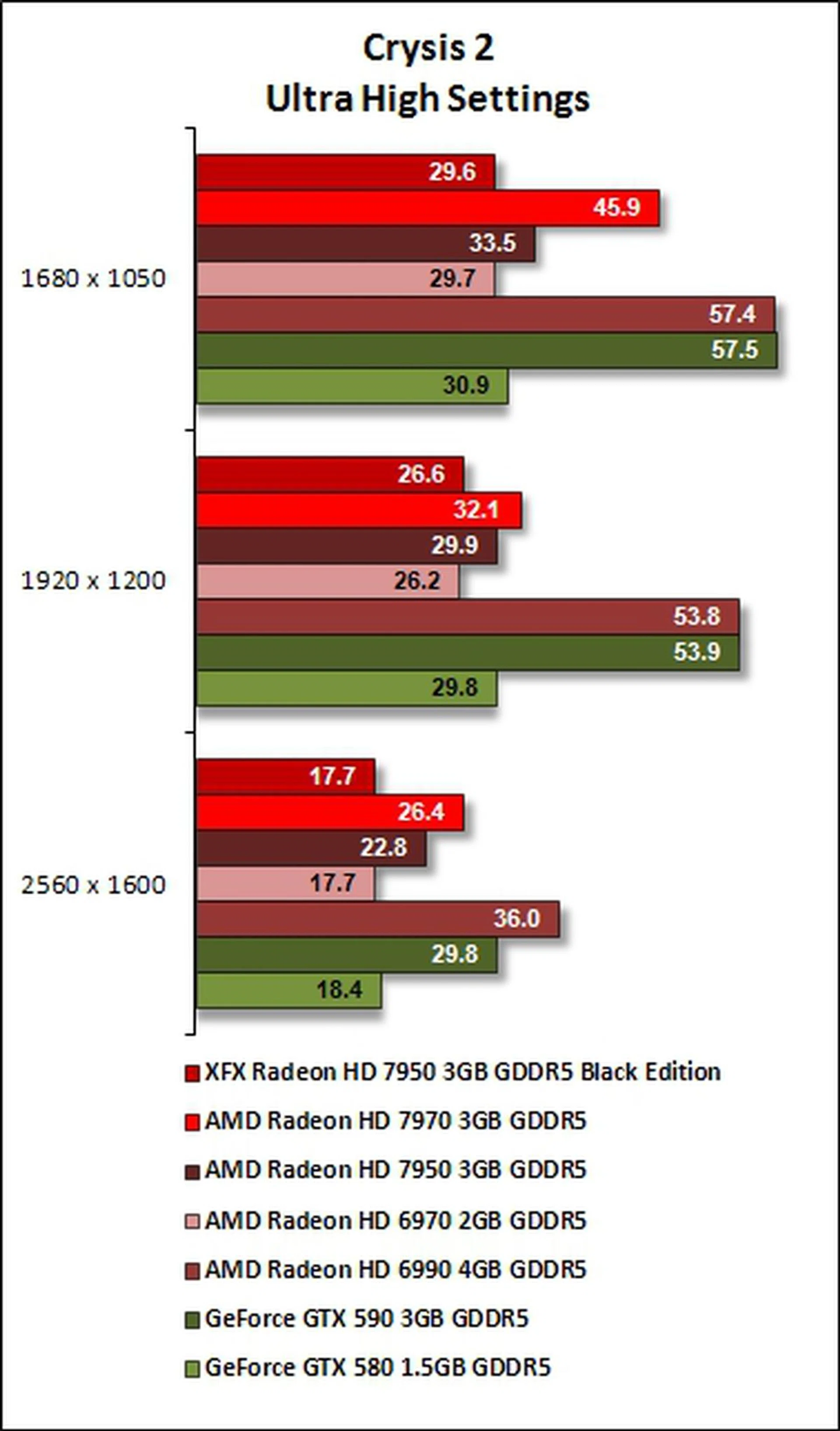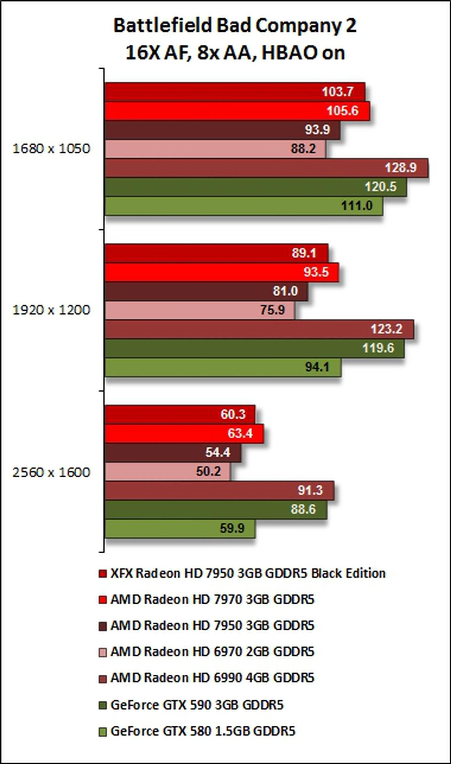 Even in its overclocked state and at the lowest resolution used in the benchmark test, the XFX R7950 Black Edition graphics card failed to cross the 30fps mark.