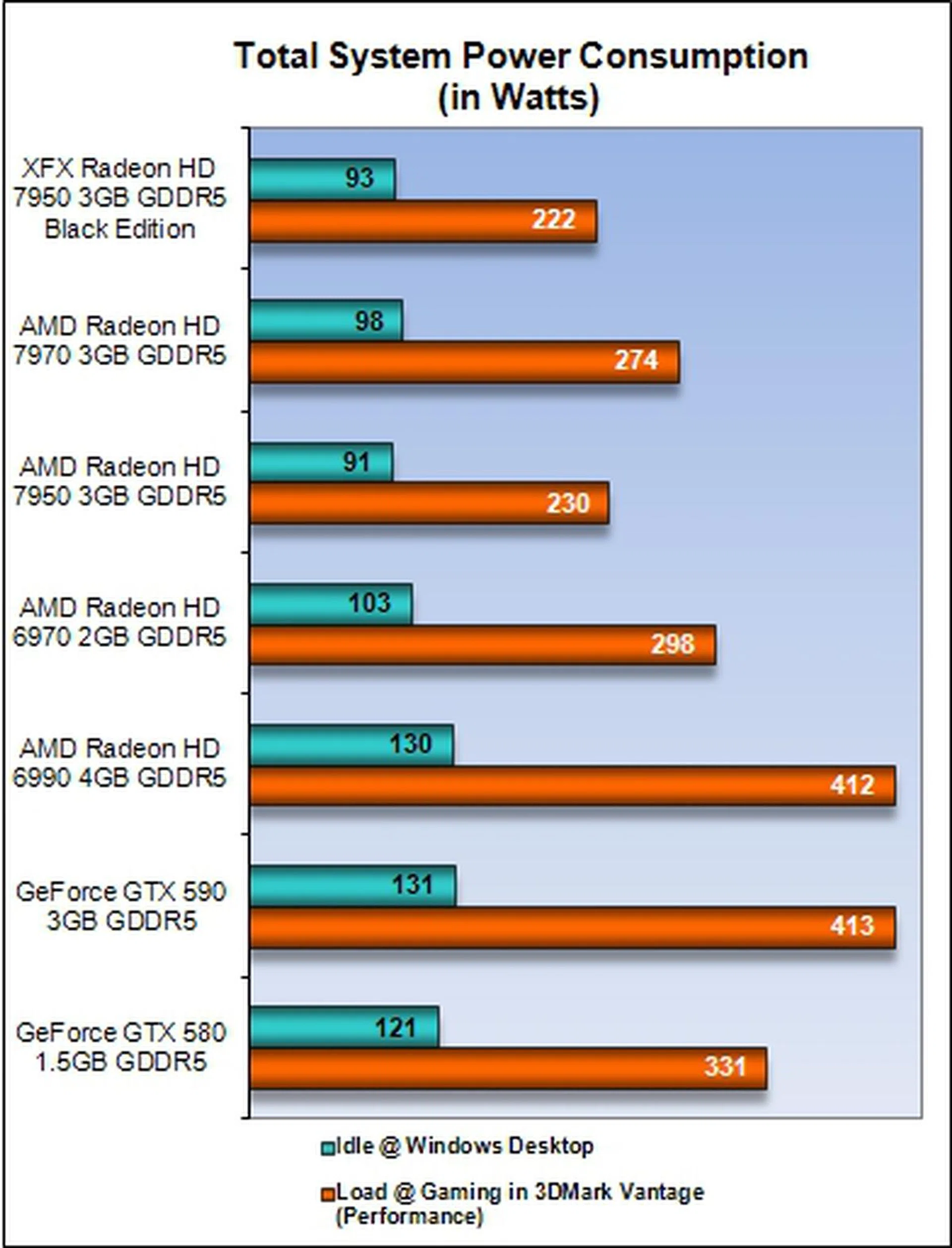 The power consumption of XFX R7950 Black Edition is even lower than the stock AMD Radeon HD 7950. We were quite impressed because the outcome reinforces XFX's dedication in selecting some of the best GPU dies along with quality components (which they term as Duratec) used on the board. The combination of this really shows with performance close to the Radeon HD 7970 and yet sipping power less than the reference Radeon HD 7950 graphics card. Not to mention, it's also a lot more power efficient than the NVIDIA GeForce GTX 580.
