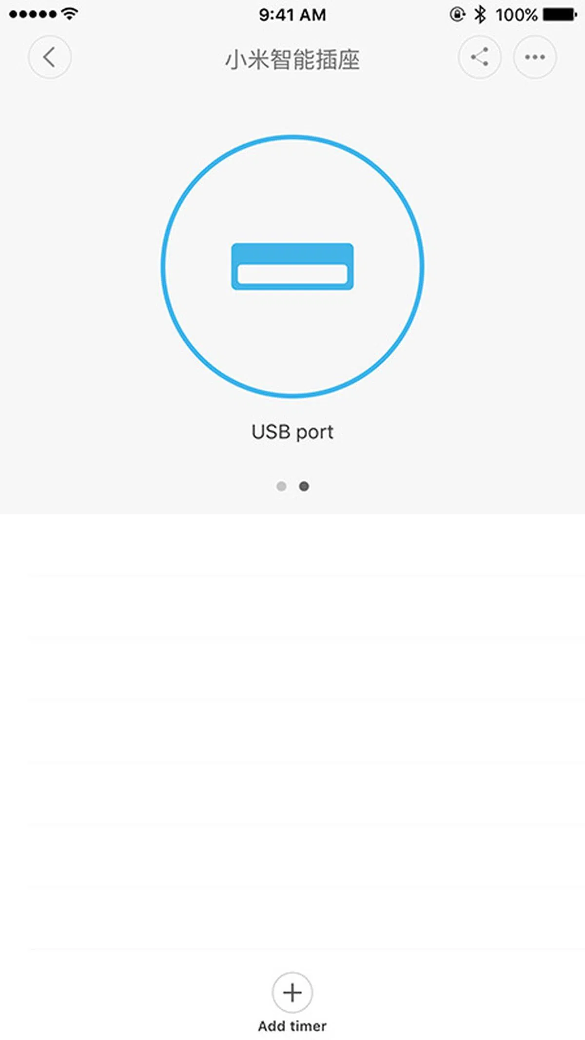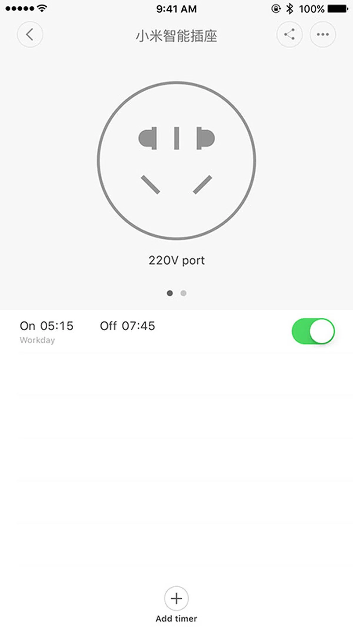 The app that allows you to control the Mi Plug is called 小米智能家庭, which literally translates to Xiaomi Smart Home. (The 小米路由器 (Xiaomi Router) app can also be used to control the Mi Plug.) Despite the Chinese name, the app seems to have been localized, as text within the app shows up in English.