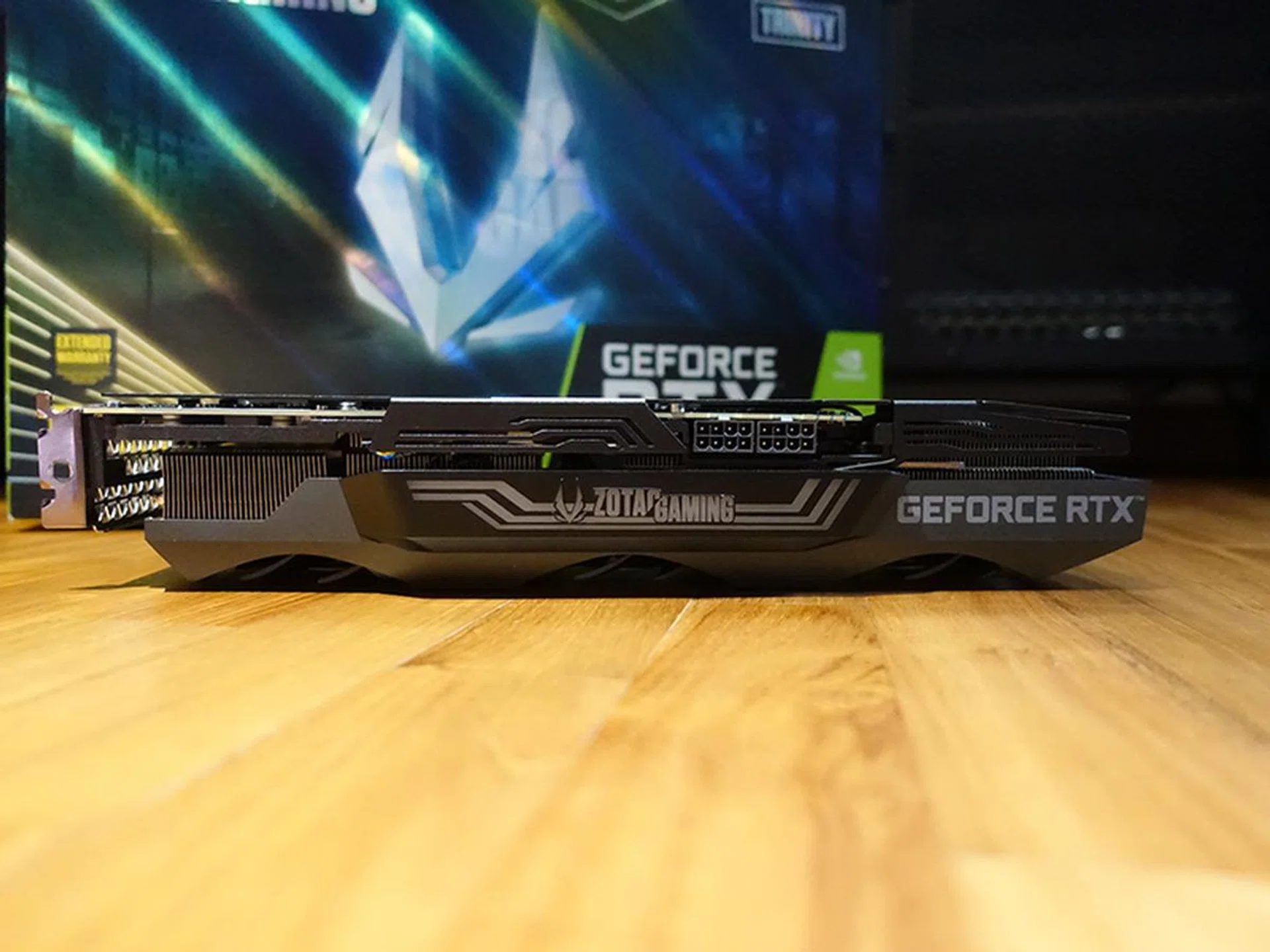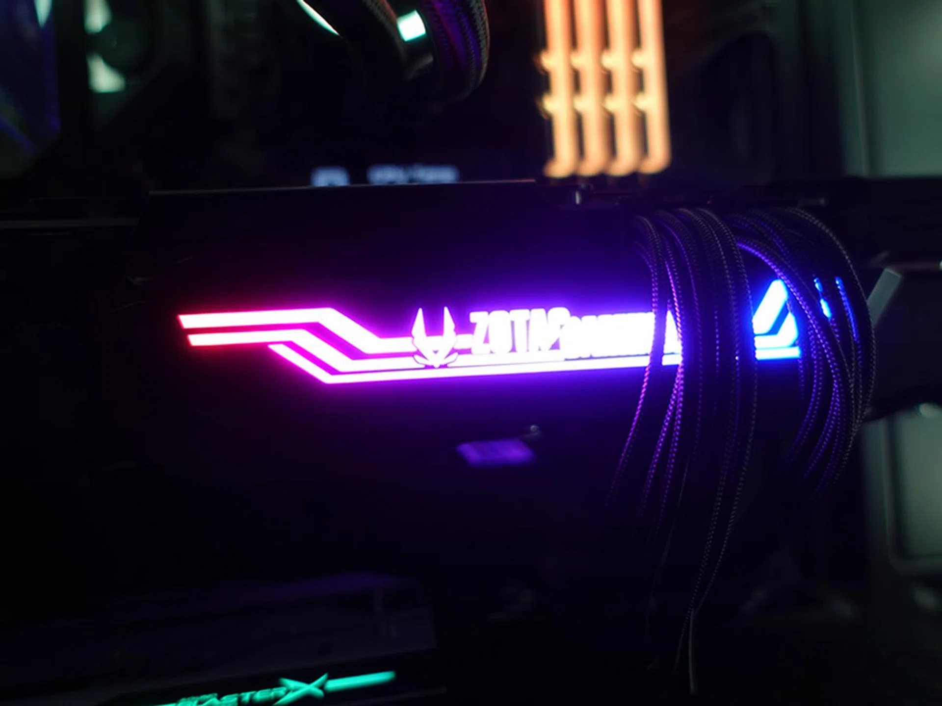 Those aren't the only LEDs found on the card though, and the side profile of the card also lights up in Zotac's Spectra 2.0 lighting. You can customise it using the company's FireStorm software, and it'll ensure that your card stand out through the side window of your case.