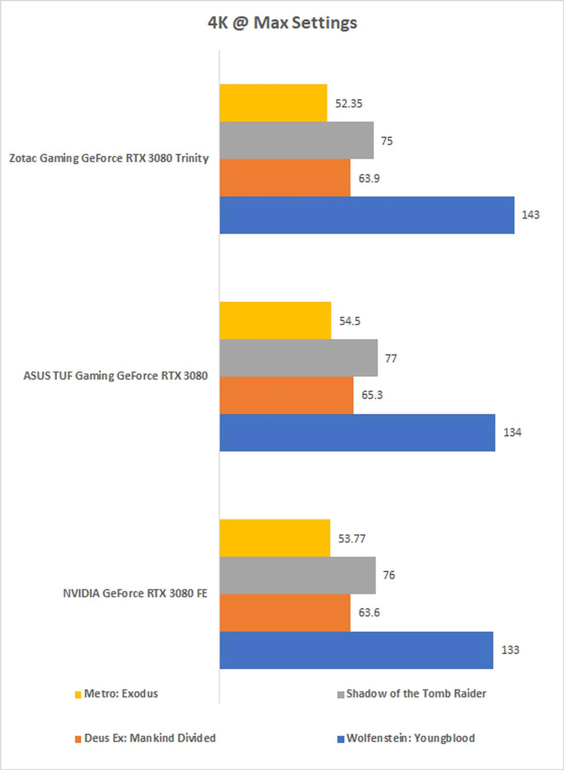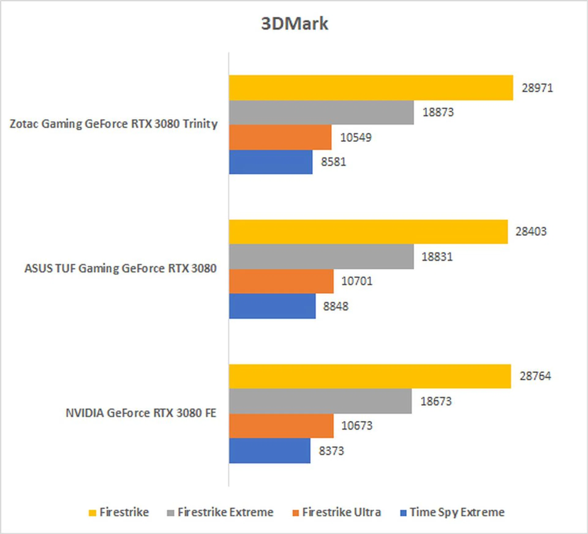 We'll be comparing the Zotac Gaming GeForce RTX 3080 Trinity against the Founders Edition model and the ASUS TUF Gaming GeForce RTX 3080, which is the other custom card we have with us at the moment. But because we've already put the GeForce RTX 3080 Founders Edition through a full suite of gaming benchmarks, we'll be running a more limited selection this time as the results don't normally vary too much from one card to another.