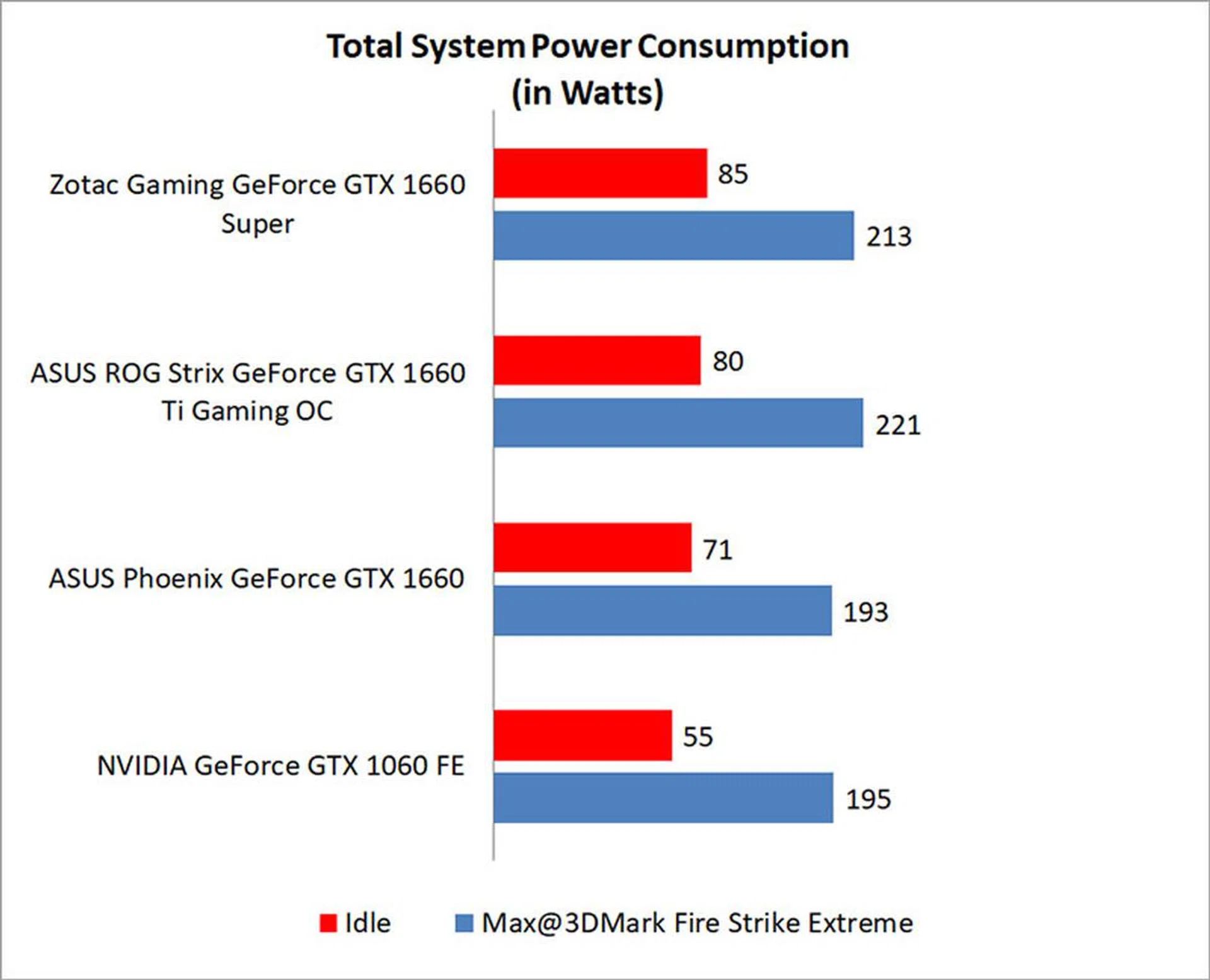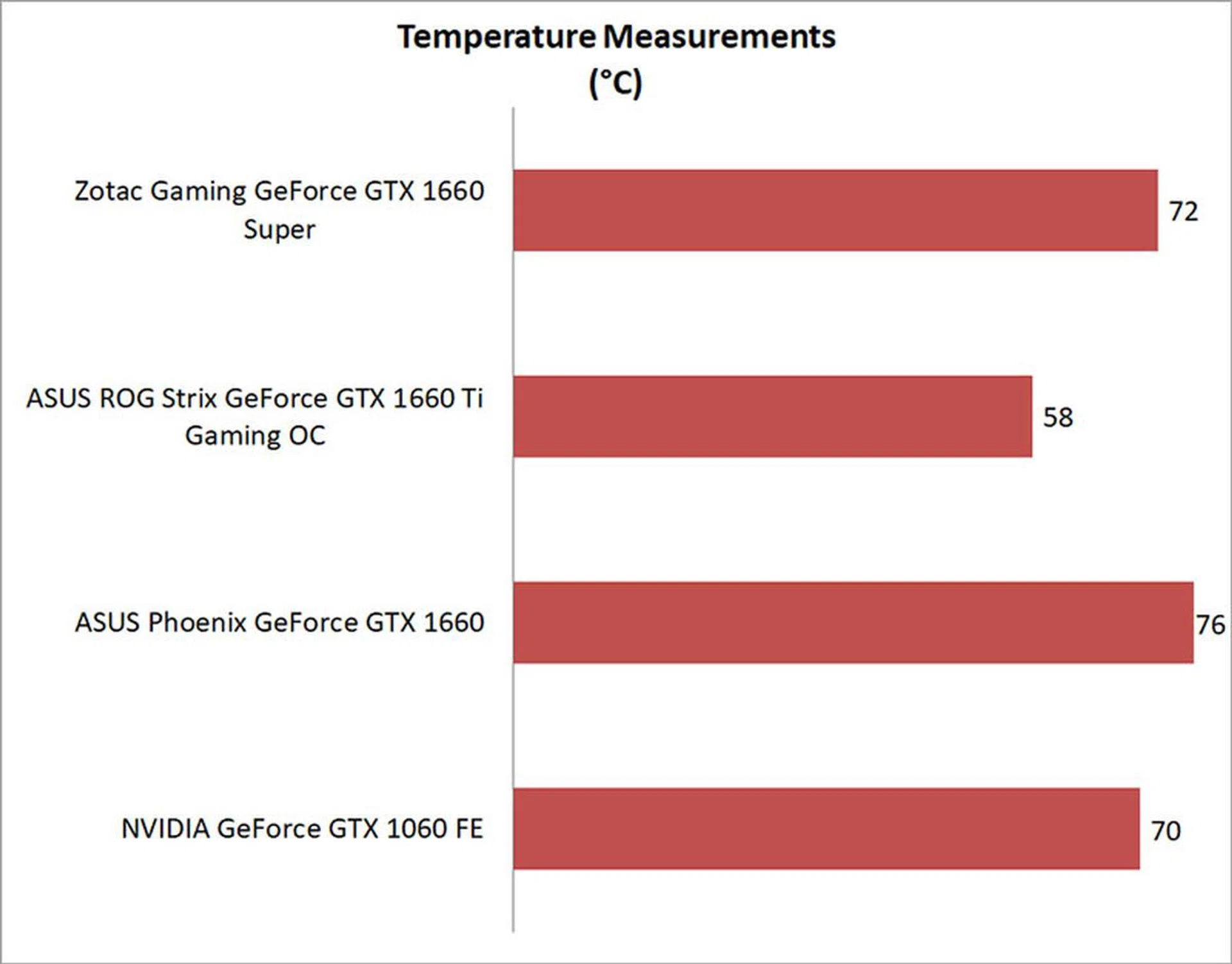 The card recorded a peak temperature of 72°C, fairly toasty for a card in this class. The ASUS ROG Strix GeForce GTX 1660 Ti ran quite cool in comparison at just 58°C, so it seems like Zotac's twin fan solution isn't quite as capable in the cooling department. Power consumption numbers are in line with what we've observed previously, slotting in right between the GeForce GTX 1660 and 1660 Ti.